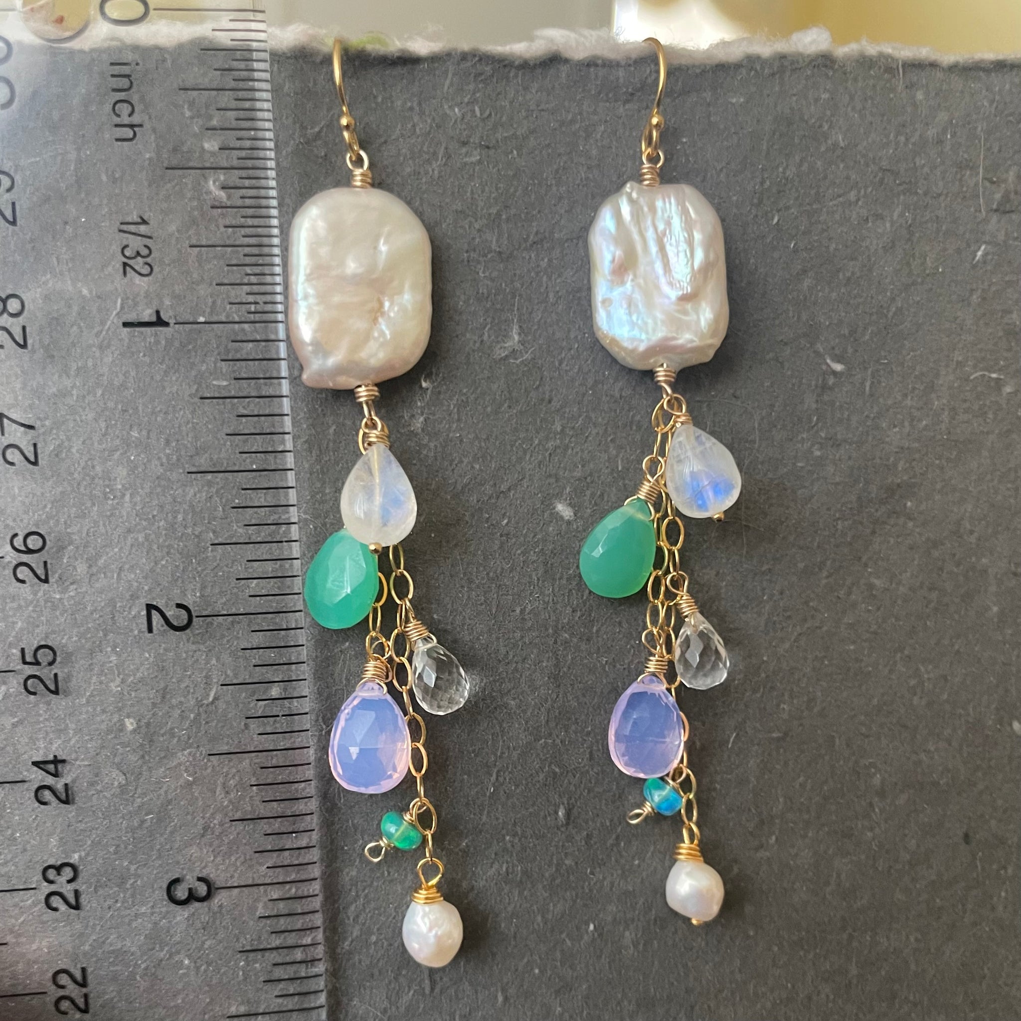 Biwa freshwater pearls wired in your choice of 14k gold filled , 14k rose gold filled, or sterling silver wire are combined in a delicate cascade with rainbow moonstone, chrysoprase ,lavender Quartz, rock crystal quartz, opals and pearls.