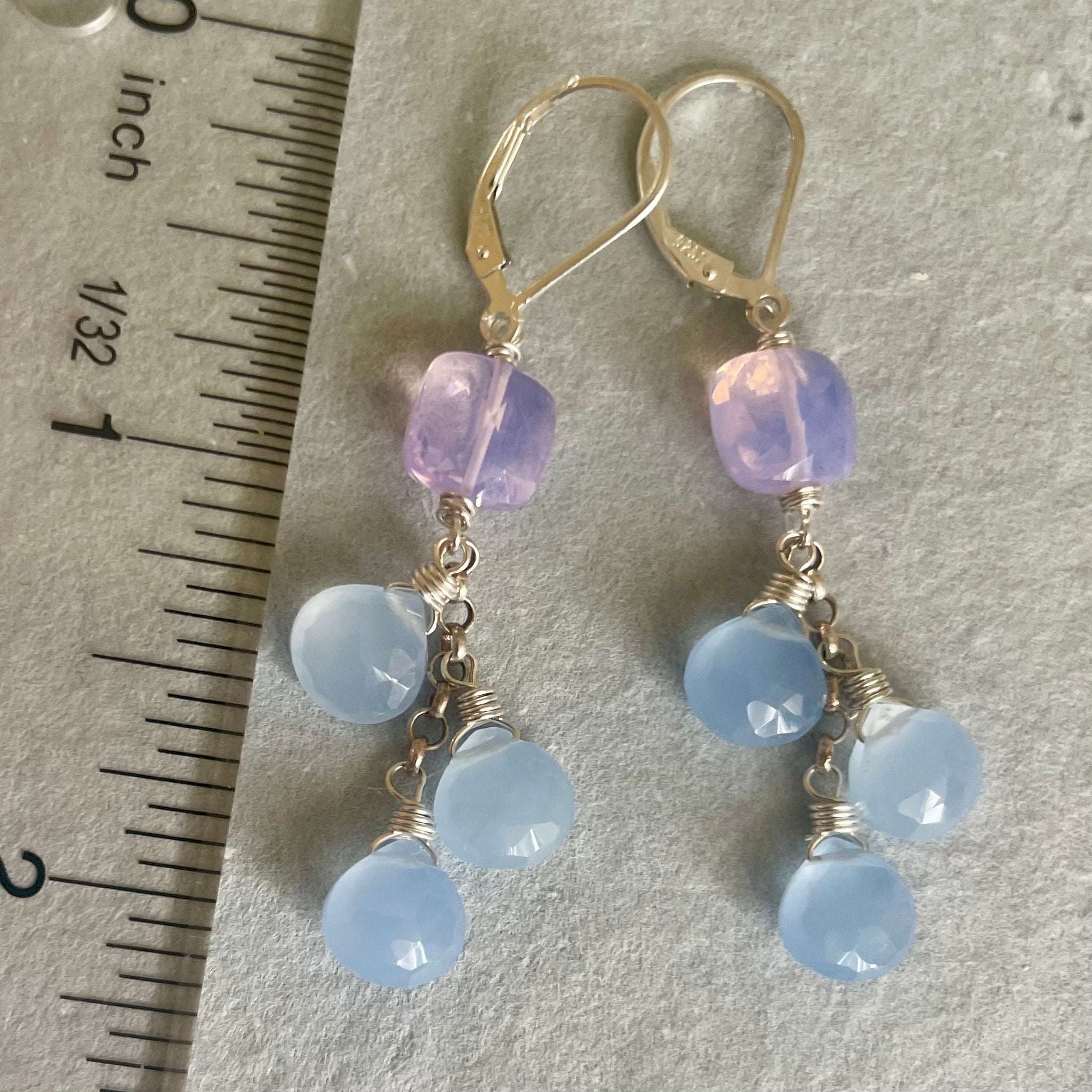 Glowing cushion cut lavender cut quartz is wired in sterling silver with mini chalcedony. The apprx length is 2”. Please note that the leverback shown is an upgrade. You must select it in the drop down menu or the default French ball hook earwires will be sent.