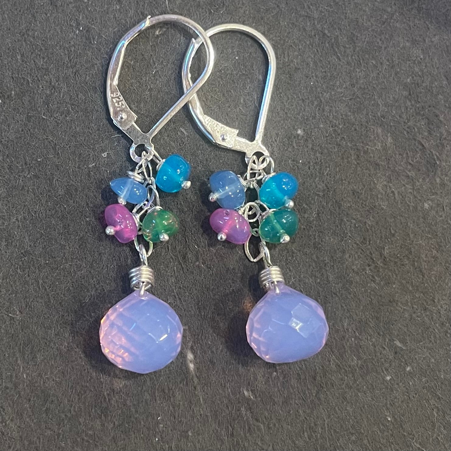 Glowing onion cut lavender cut quartz is wired in sterling silver with mini opals. The apprx length is 1.5”. Please note that the leverback shown is an upgrade. You must select it in the drop down menu or the default French ball hook earwires will be sent.