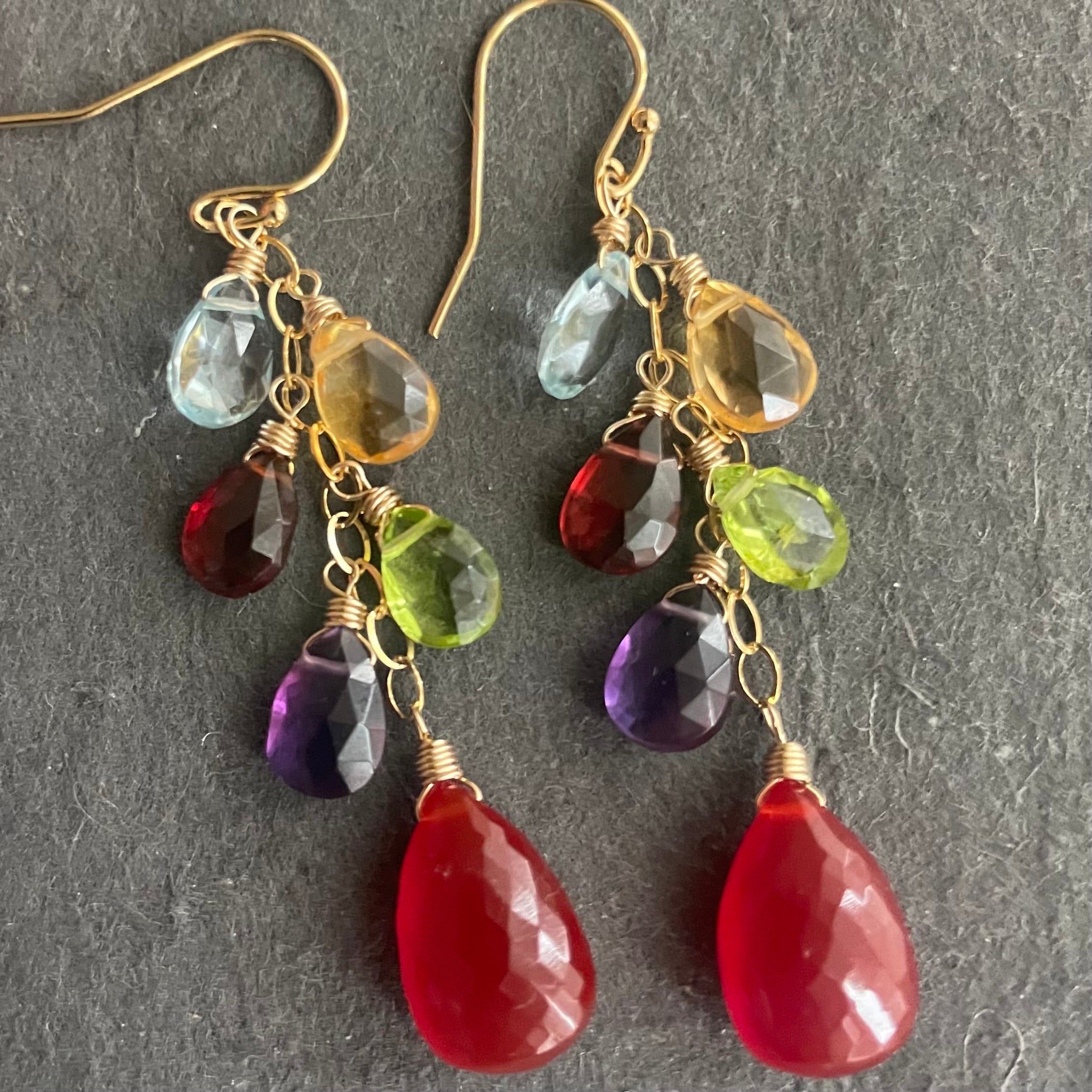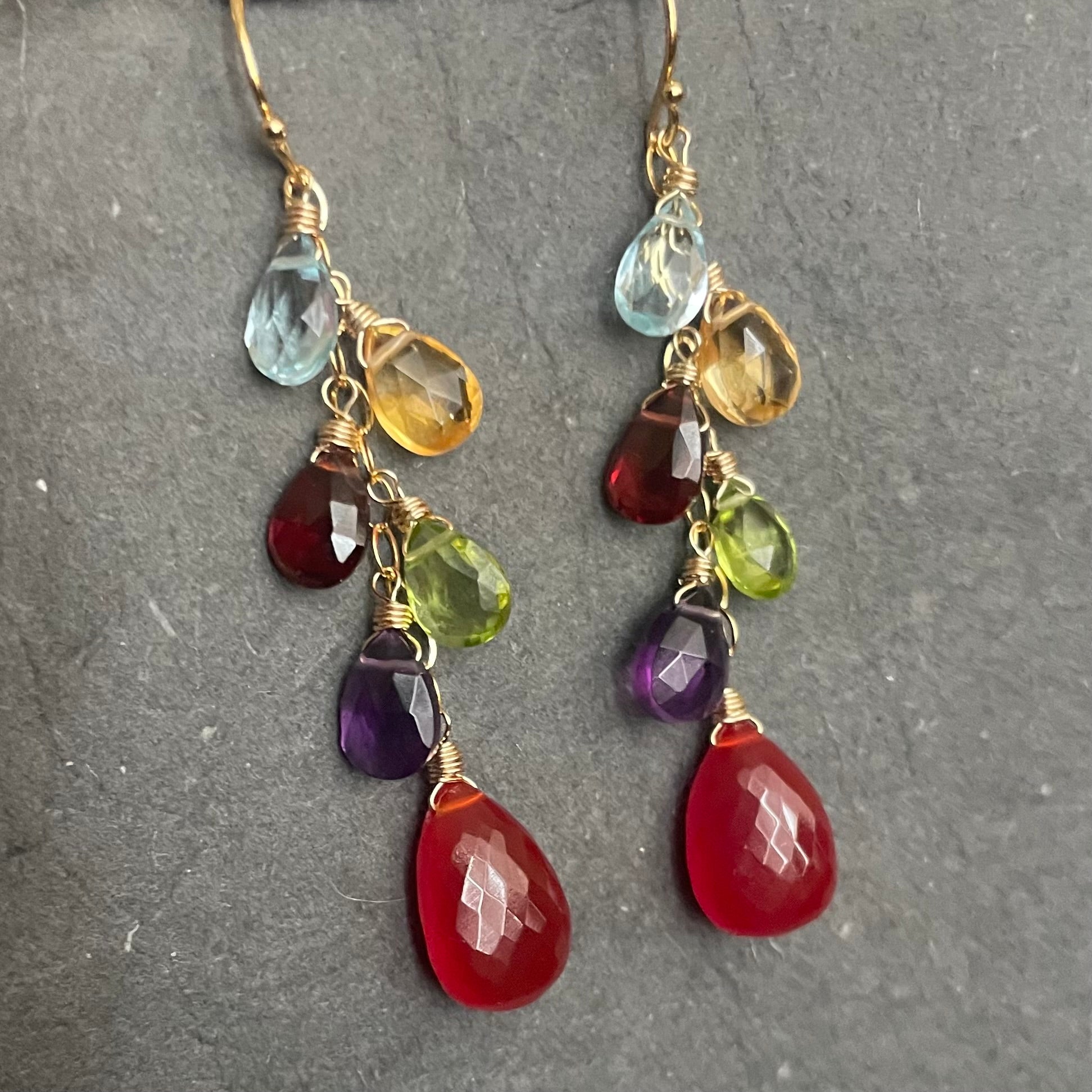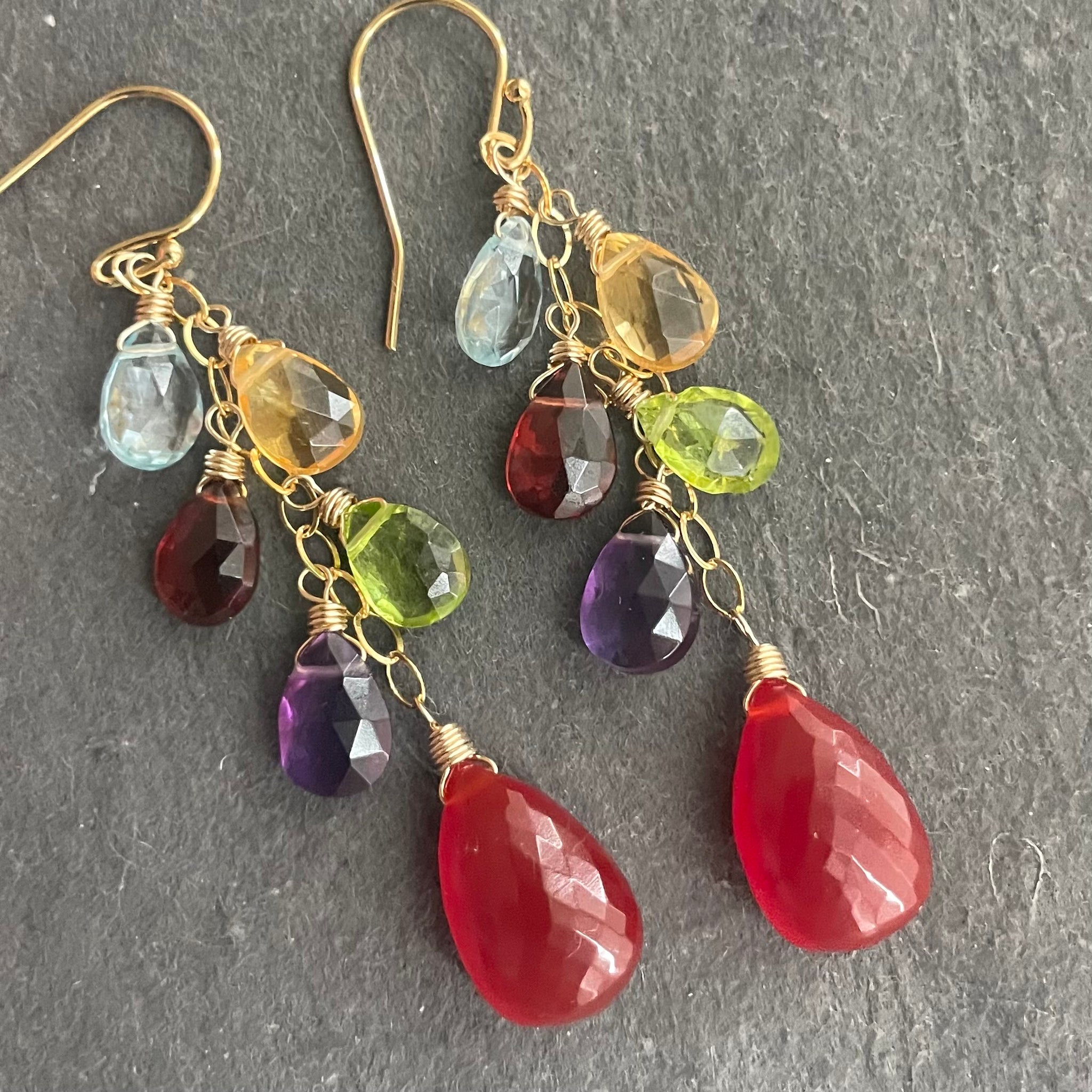 They are wired in 14k gold filled wire with 14k gold filled chain and French ball earwire. The natural gemstone accent stones are blue topaz , citrine peridot, garnet, peridot and amethyst. The approximate total length is 2 3/8”.