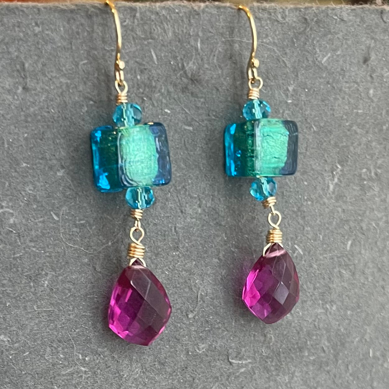 Video on Instagram 1/27/26. These are fairly petite but they pack a PUNCH of color! These colorful and beautiful authentic Venetian Glass and feature gold and are works of art! Fabulous cube glass with mini crystals and faceted shield cut quartz in magenta  is placed on 14k gold filled gold filled wiring. French ball hook earwire or leverback. Shown are 14k gold filled French ball hooks. I include rubber backs. Each pair will be very similar yet unique due to the handmade glass. If you need to see your exact beads before ordering let me know.