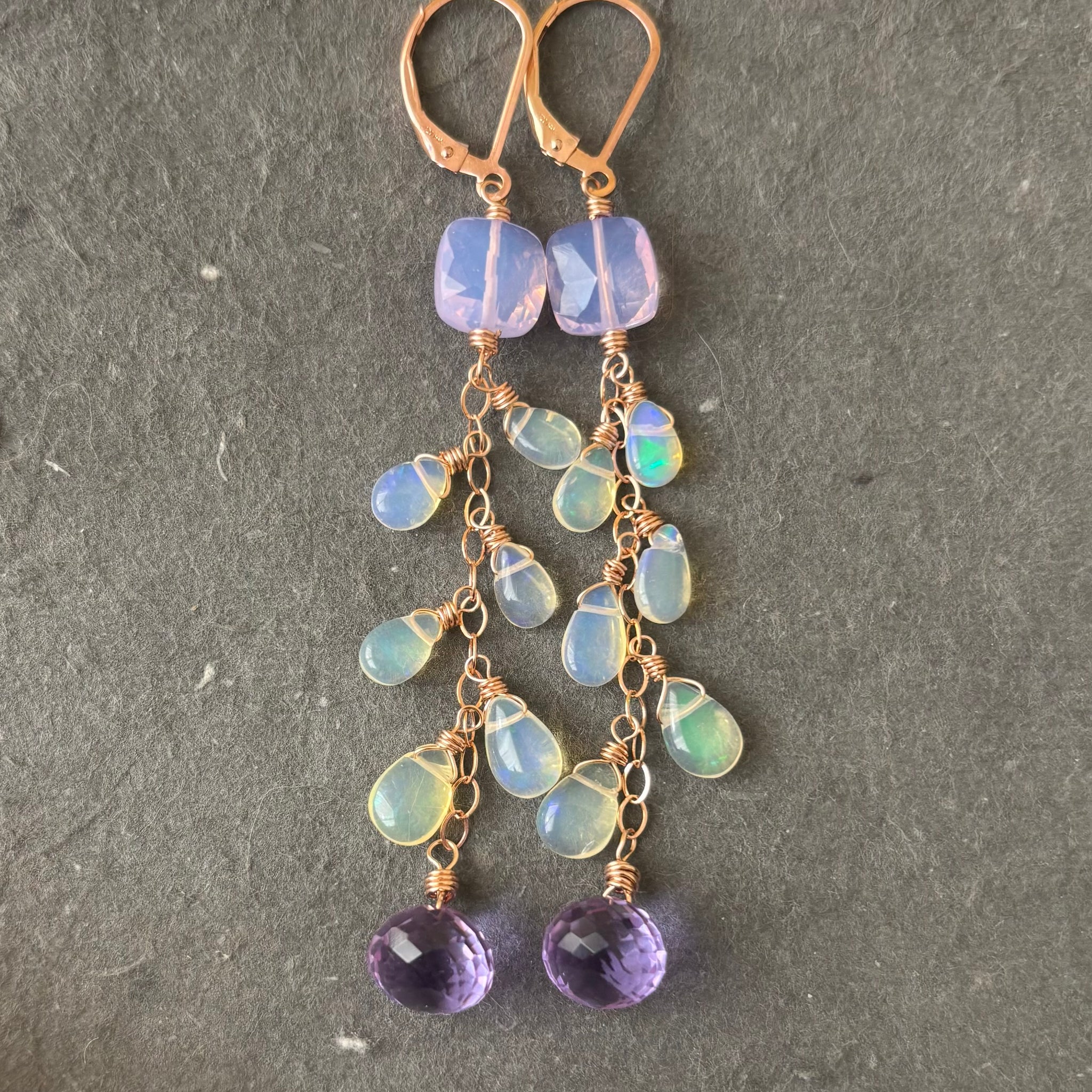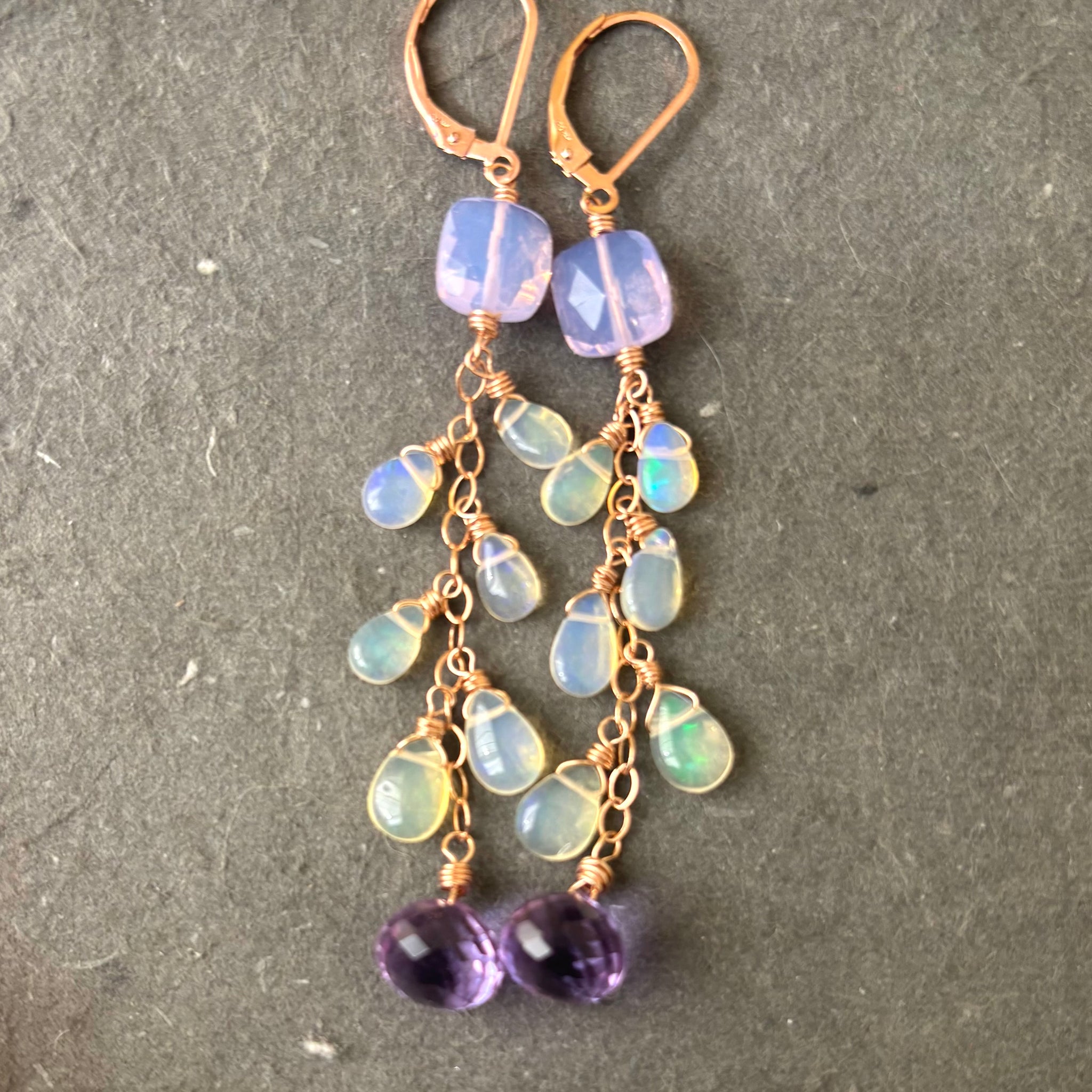 **YOU MUST CHOOSE YOUR METAL AND EARWIRES ON THIS AS THE PHOTOS REFLECT A LEVERBACK UPGRADE , PLEASE** Cushion cut lavender quartz, and grape onion quartz at the bottom bring out the intense reflective colors in these welo opals. Shown is Rose gold filled chain and leverback. Length is about 2 7/8”. Your jewelry will arrive beautifully giftboxed.