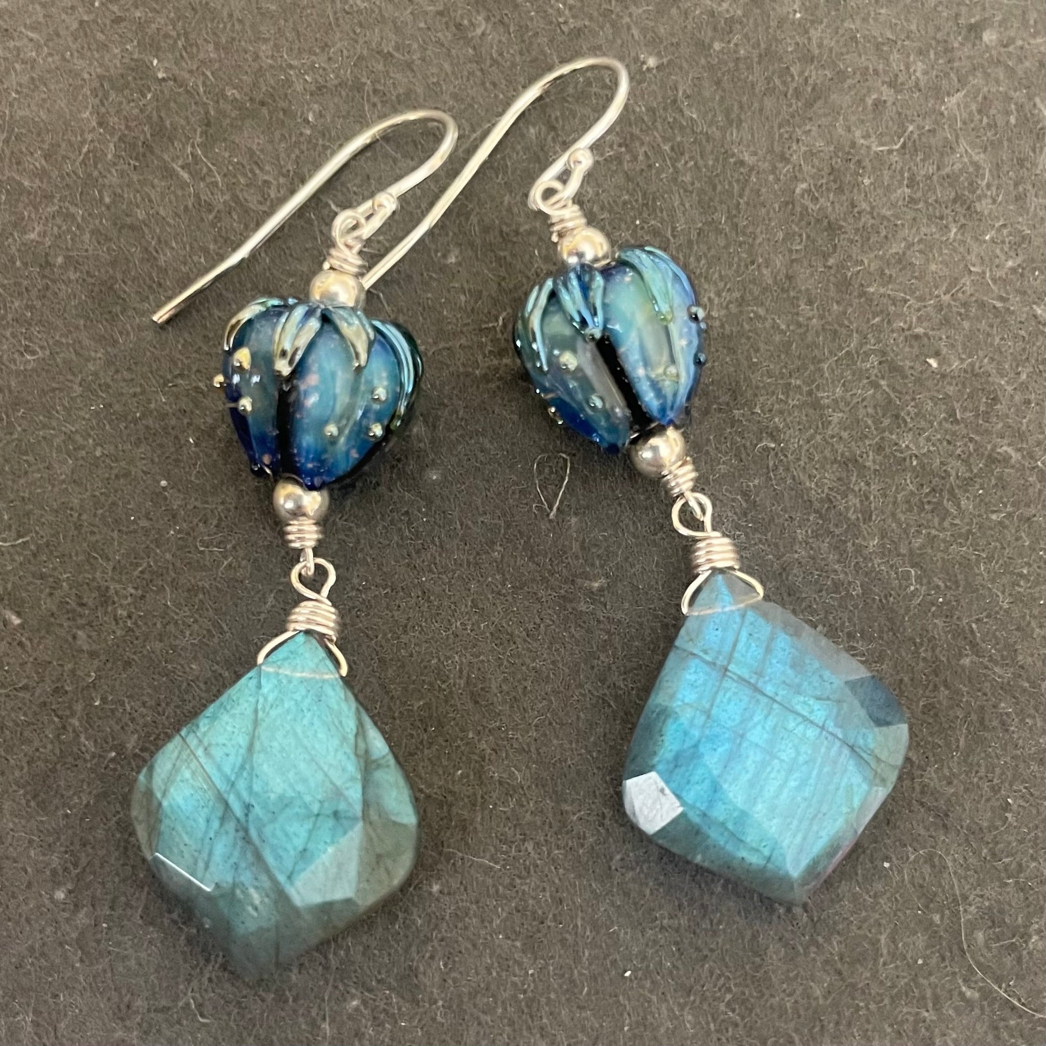 Wonderfully flashing and cut labradorite wired in sterling silver with sublime floral lampwork glass to accentuate that flash! All stones are wired with sterling silver wire. Shown are sterling silver French ball earwires. Video is on Instagram 2/6/26.