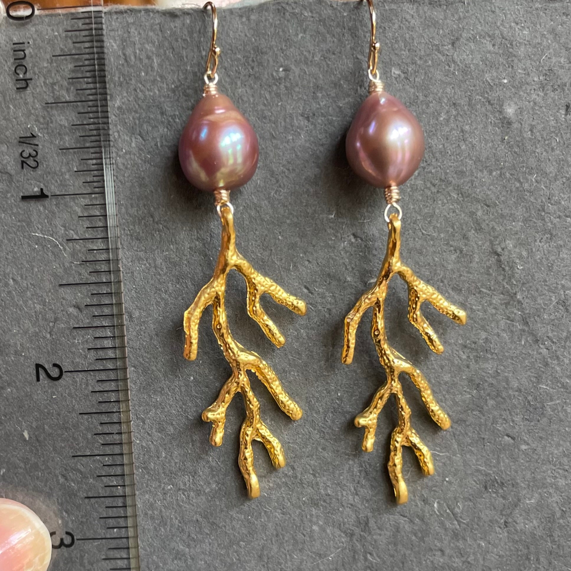 Lovely pearls in a classy mauve color wired in gold filled wire with fun gold alloy coral branches.  14k gold filled French ball or leverback earwires. Nickel and lead free. Please note there may be surface imperfections on these types of pearls.