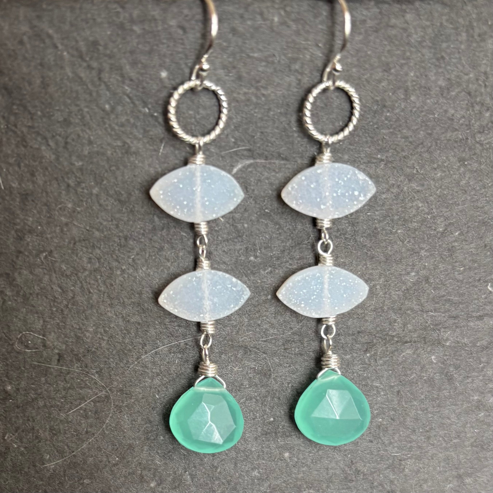 Subtle Sparkle! Eye shaped druzy quartz and faceted seafoam aqua chalcedony on your choice of 14k gold filled, sterling silver or 14k rose gold filled metals. Shown are sterling silver French ball earwires. The total length of the earring is about 2 3/8”. If shopping directly from shirzay.com there are leverback upgrades available, otherwise the default of the RG French ball hook will be sent.