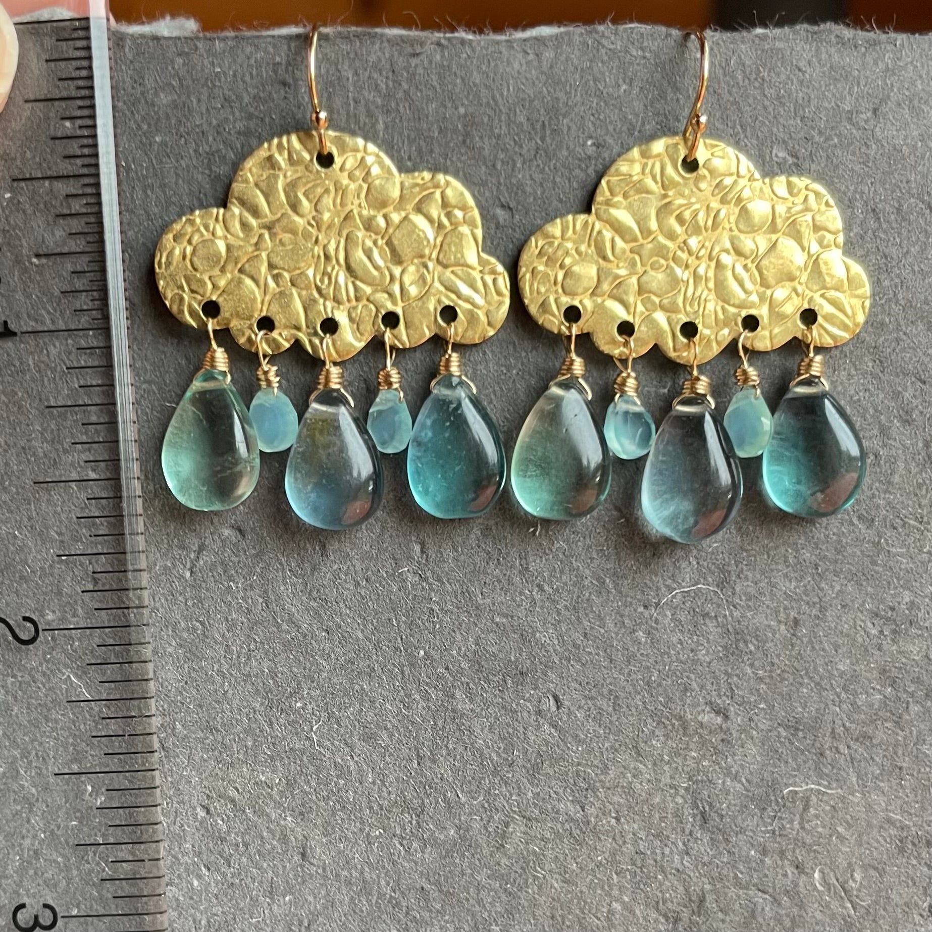 Statement earrings that I think you’ll wear often. I have wired smooth fluorite and faceted chalcedony with 14k gold filled wires into gold plated alloy nickel and lead free clouds. 14k gold filled French ball earwires (as the only option)complete the look.