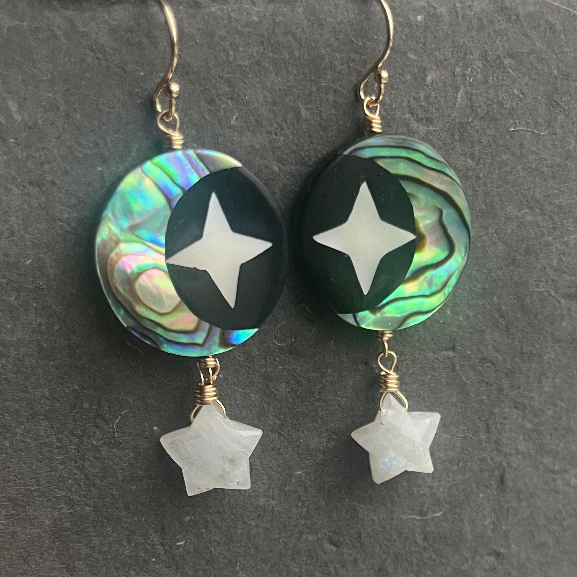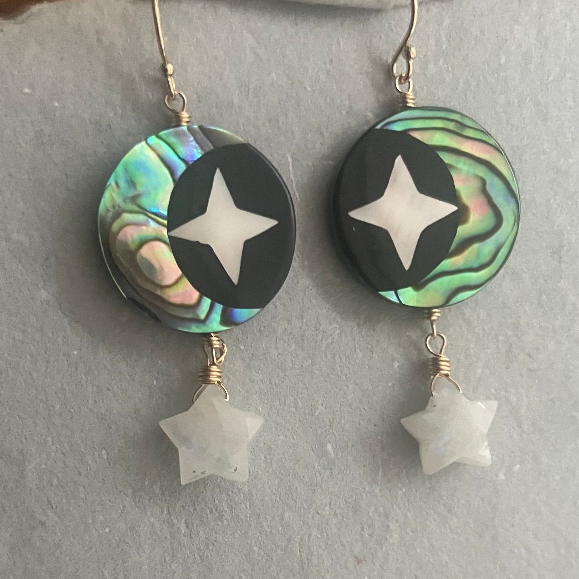 Mother of Pearl Moon and Stars Earrings, Rainbow moonstone Star OOAK. These are fun! They have the mother of pearl inlaid on both sides, are wired with 14k gold filled wires and earwires. Rainbow moonstone with a nice blue flash carved and faceted stars complete the look.