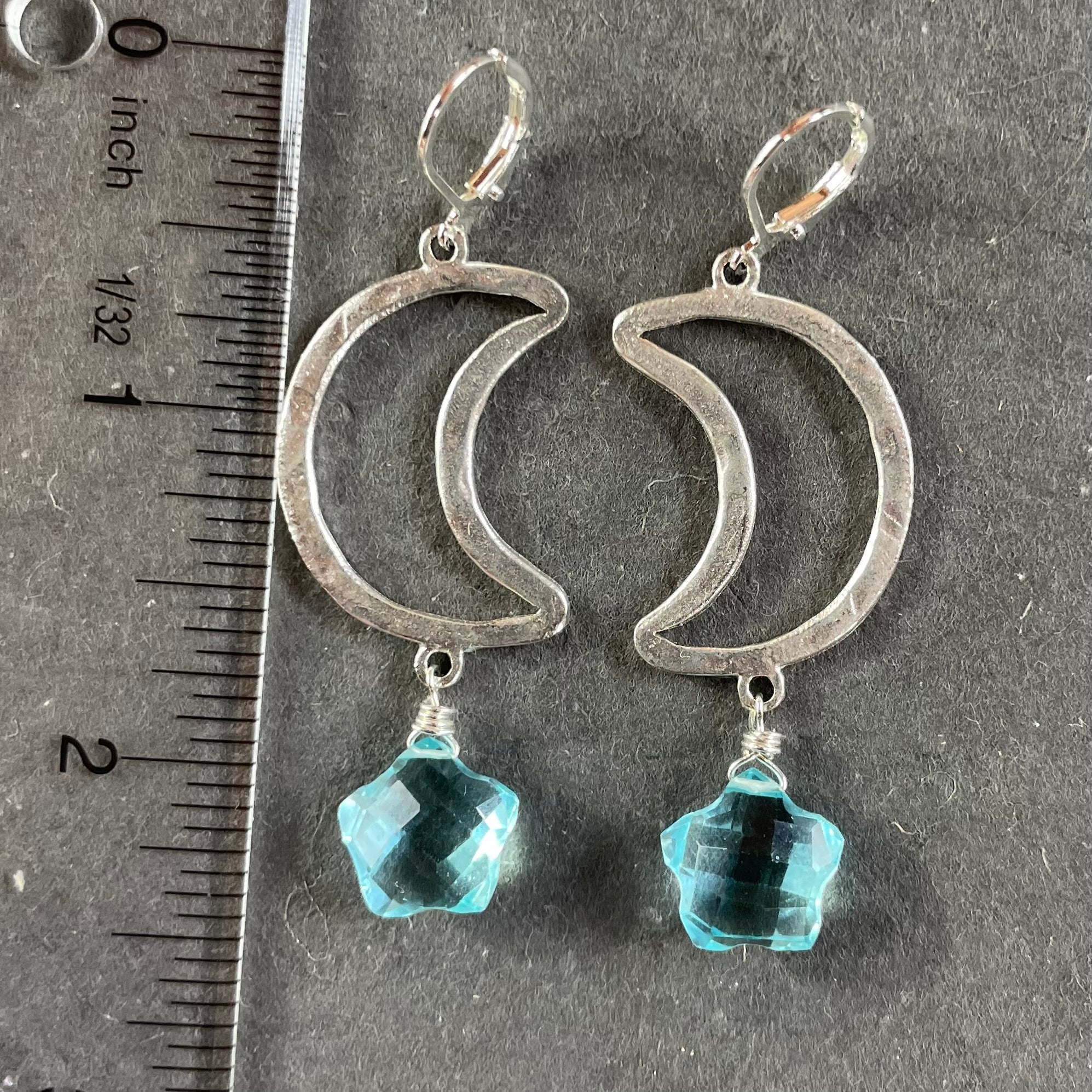 Faceted and carved aqua blue moons dangle playfully from pewter textured moons. Silver plated leverback earwires. Nickel and lead free.