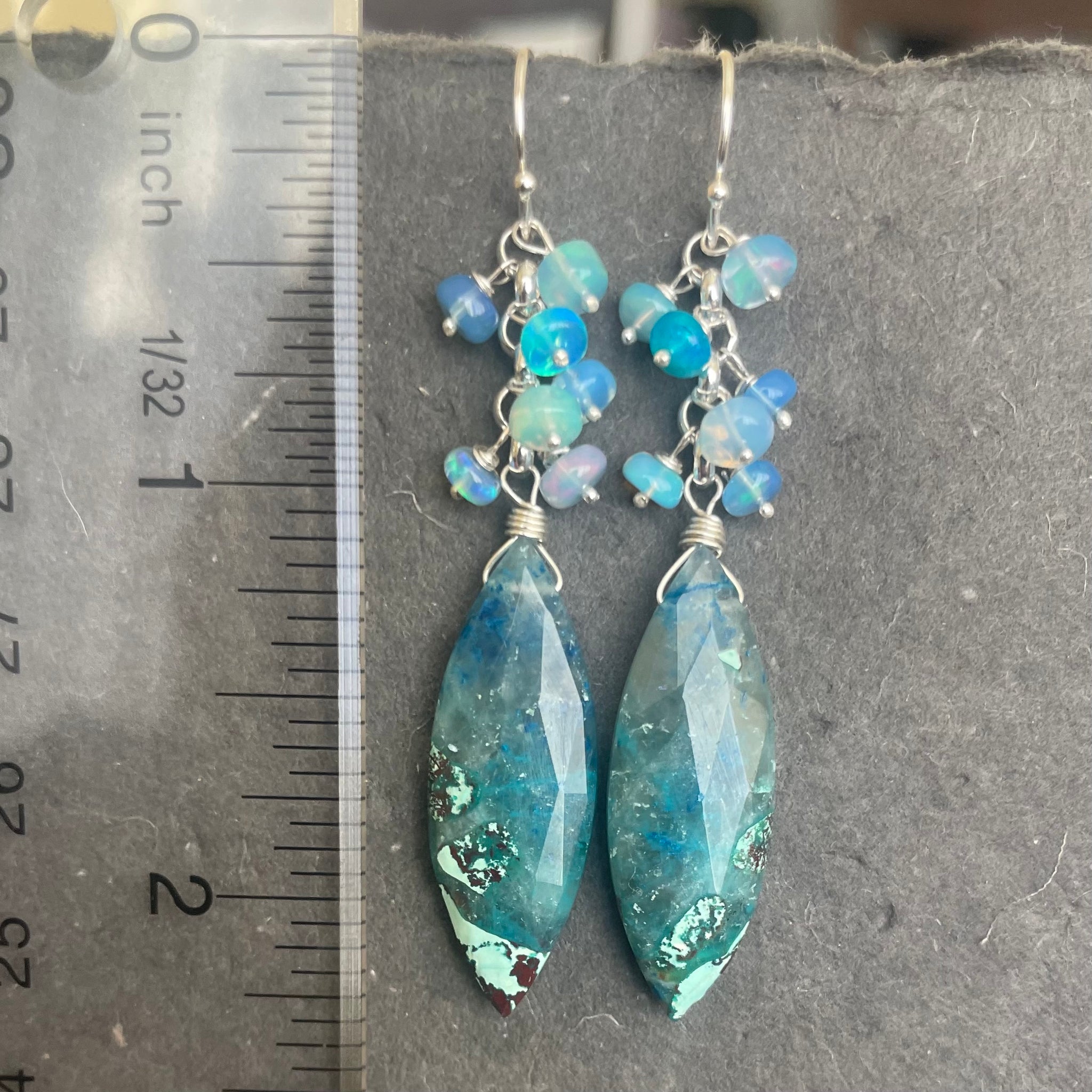 Chrysocolla faceted marquis and opal earrings, OOAK. These lovelies are faceted, and very unique. I selected some smooth opals to bring out the colors of the stones. Just one pair is available.