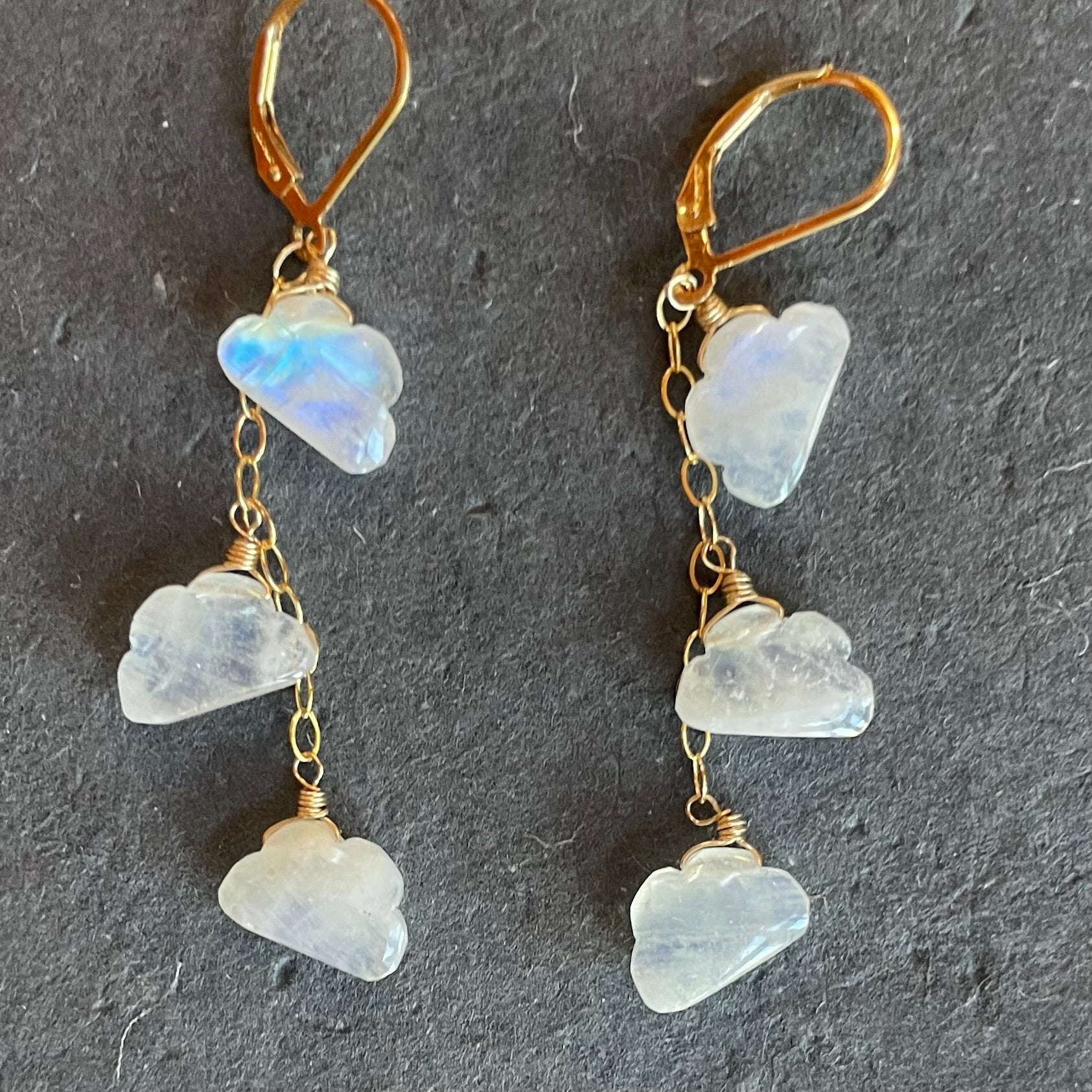 Three wonderful carved rainbow moonstone clouds with plenty of blue flash wired on 14k gold filled wire and chain. The earwire shown is the 14k gold filled leverback.