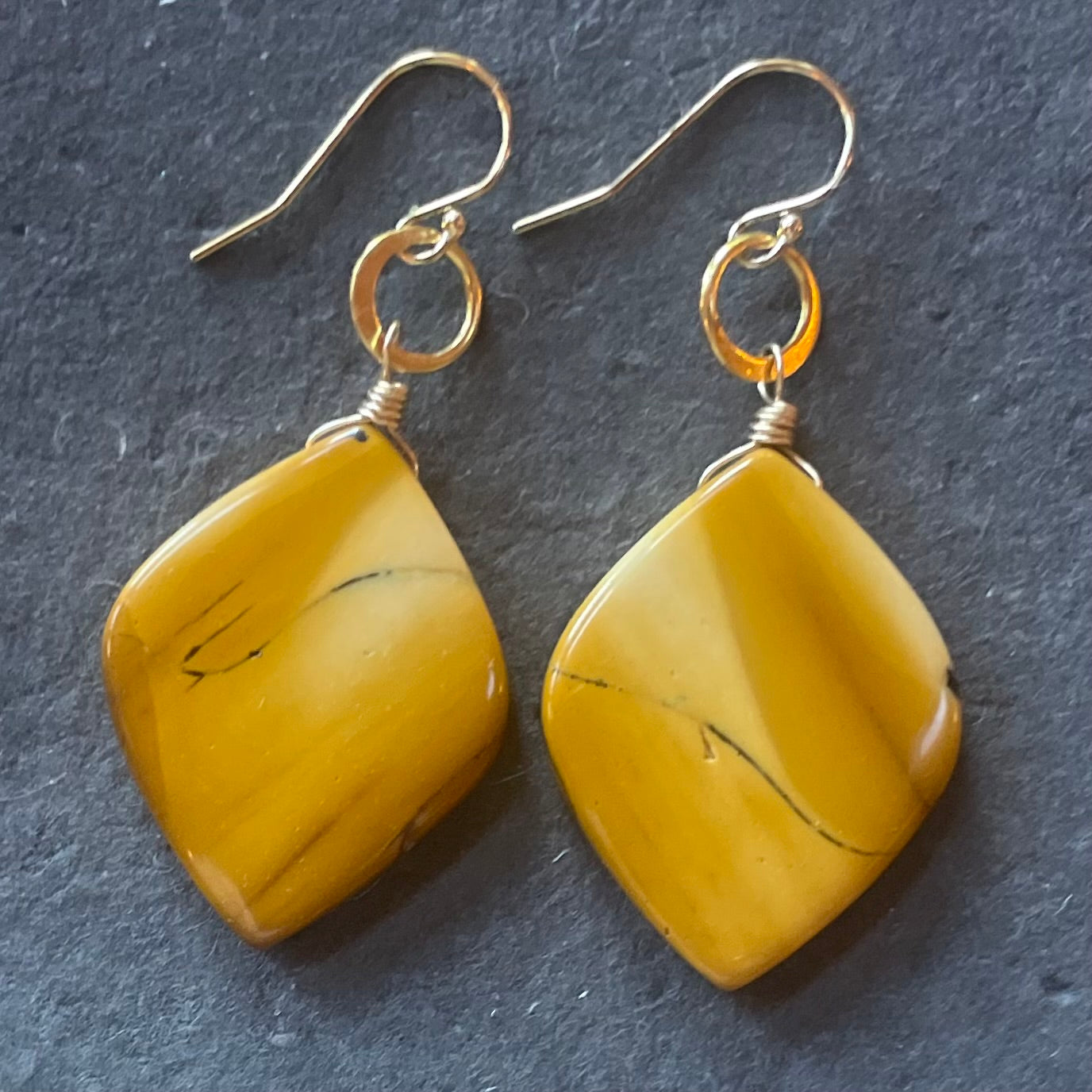 I was drawn to the stunning color and cut of these Mookaite stones. They are wired in 14k gold filled wire with your choice of 14k gold filled French ball earwires shown or choose the upgrade leverbacks in the the same metal.
