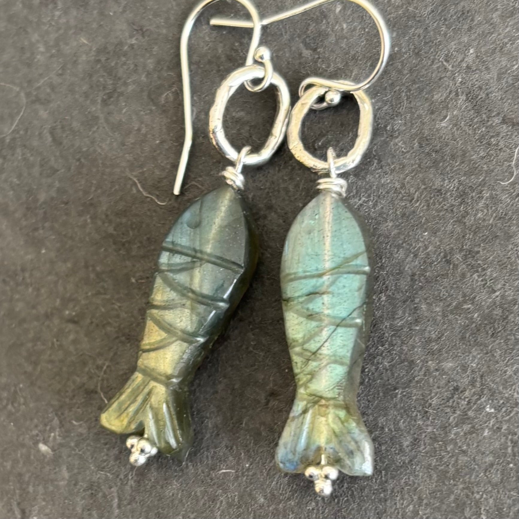 Beautiful flashy carved labradorite fish earrings on artisan sterling silver links. Sterling silver French ball earwires . APPRX length 1.75”.