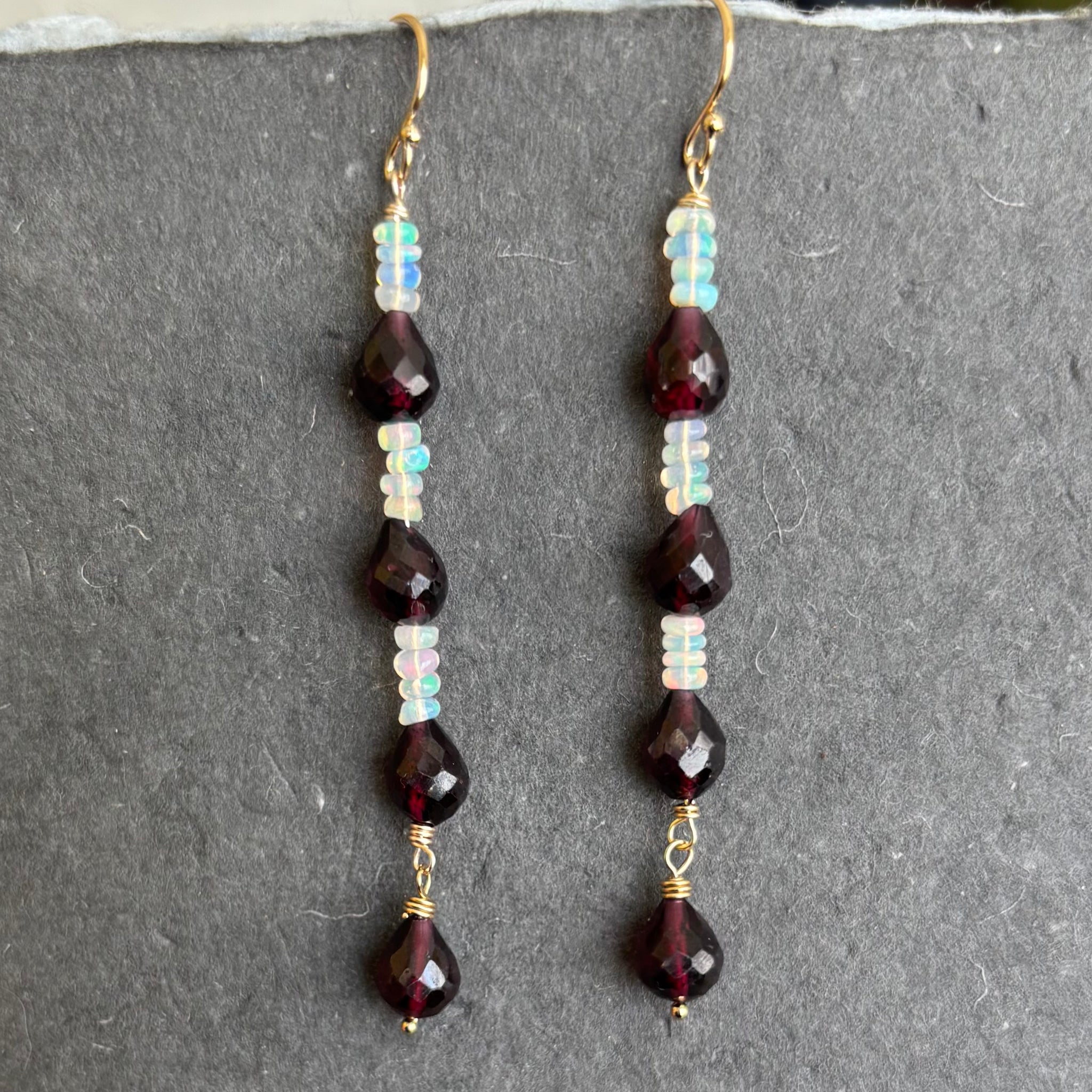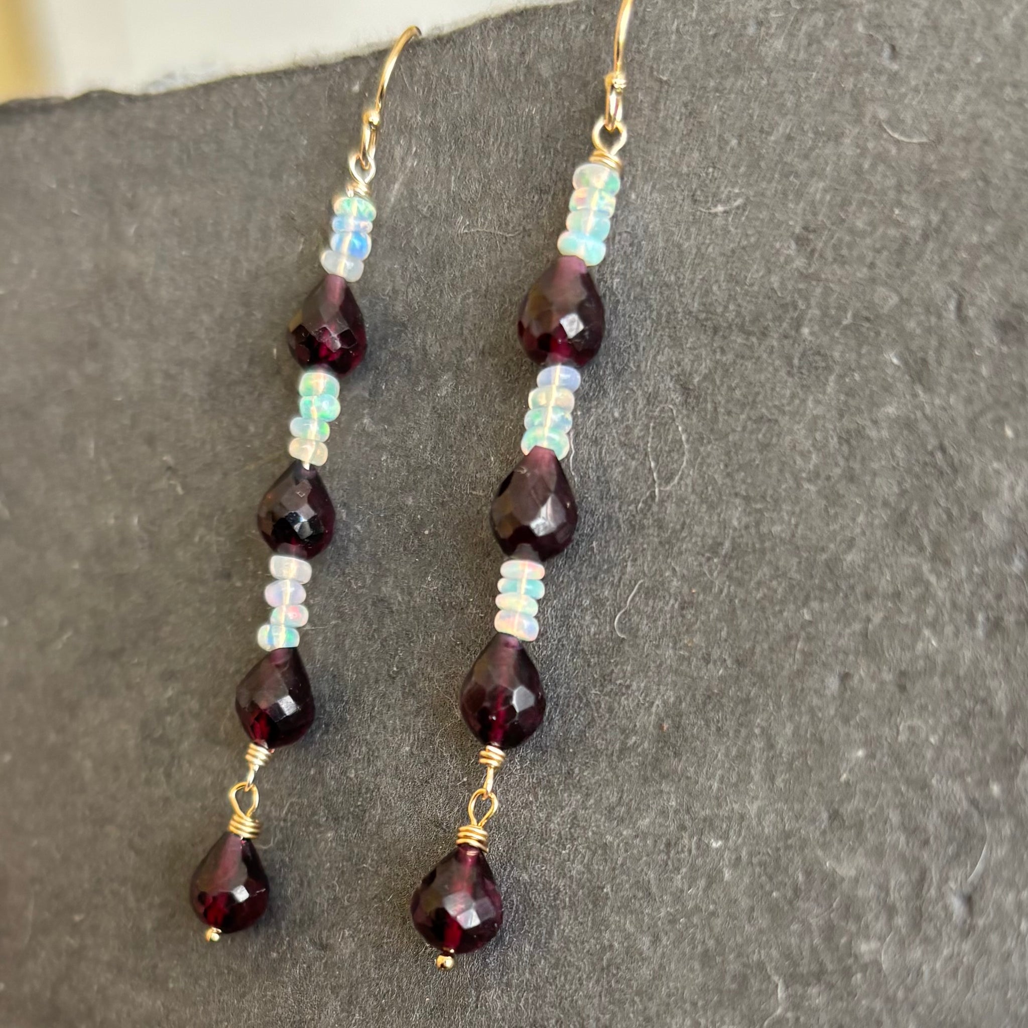 Gorgeous Garnets! Faceted Teardrop Rhodolite "pink" garnets and opals dangle from 14k gold filled wiring. Please note the earrings shown are the 14k gold filled French ball hook earrings. For video please see Instagram 10/21.