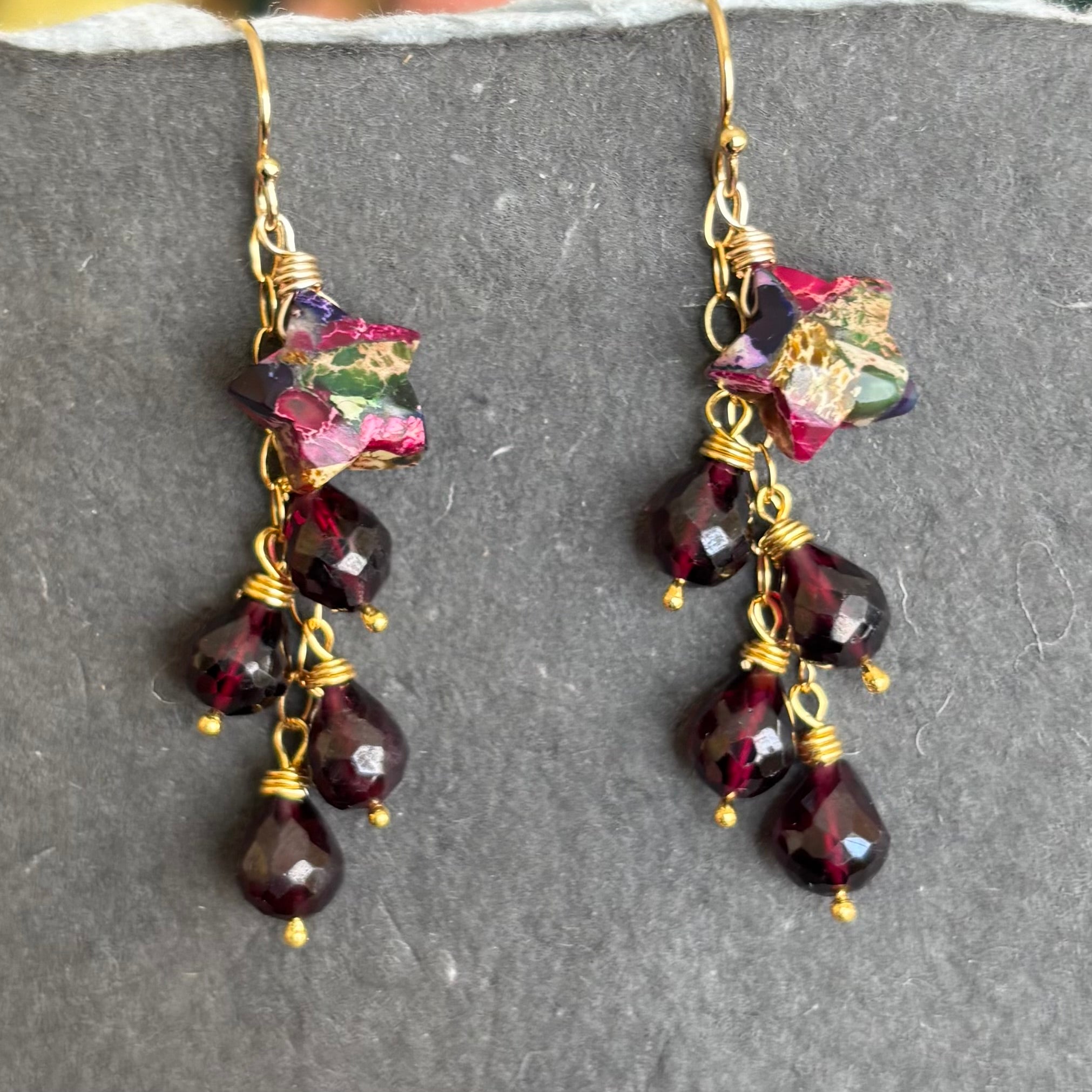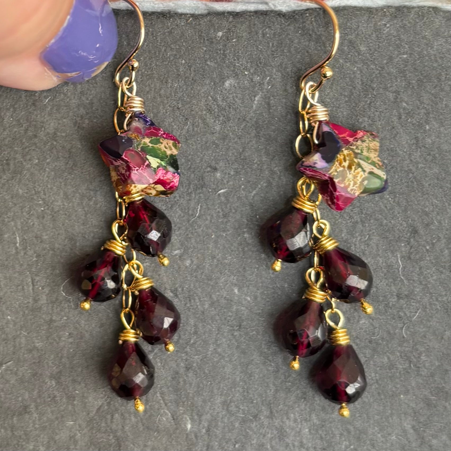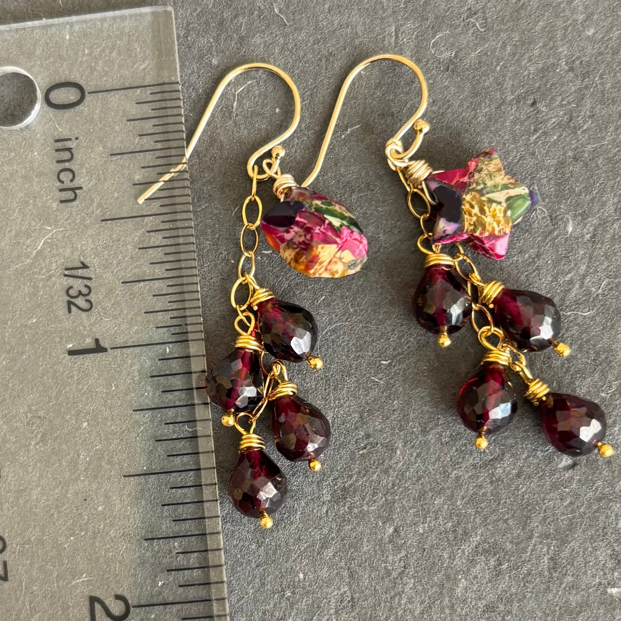 Sexy Star and Garnets! Carved and faceted Mohave Turquoise and Faceted Teardrop Rhodolite "pink" garnets dangle from 14k gold filled chain. Please note the earrings shown are the 14k gold filled French ball hook earrings.