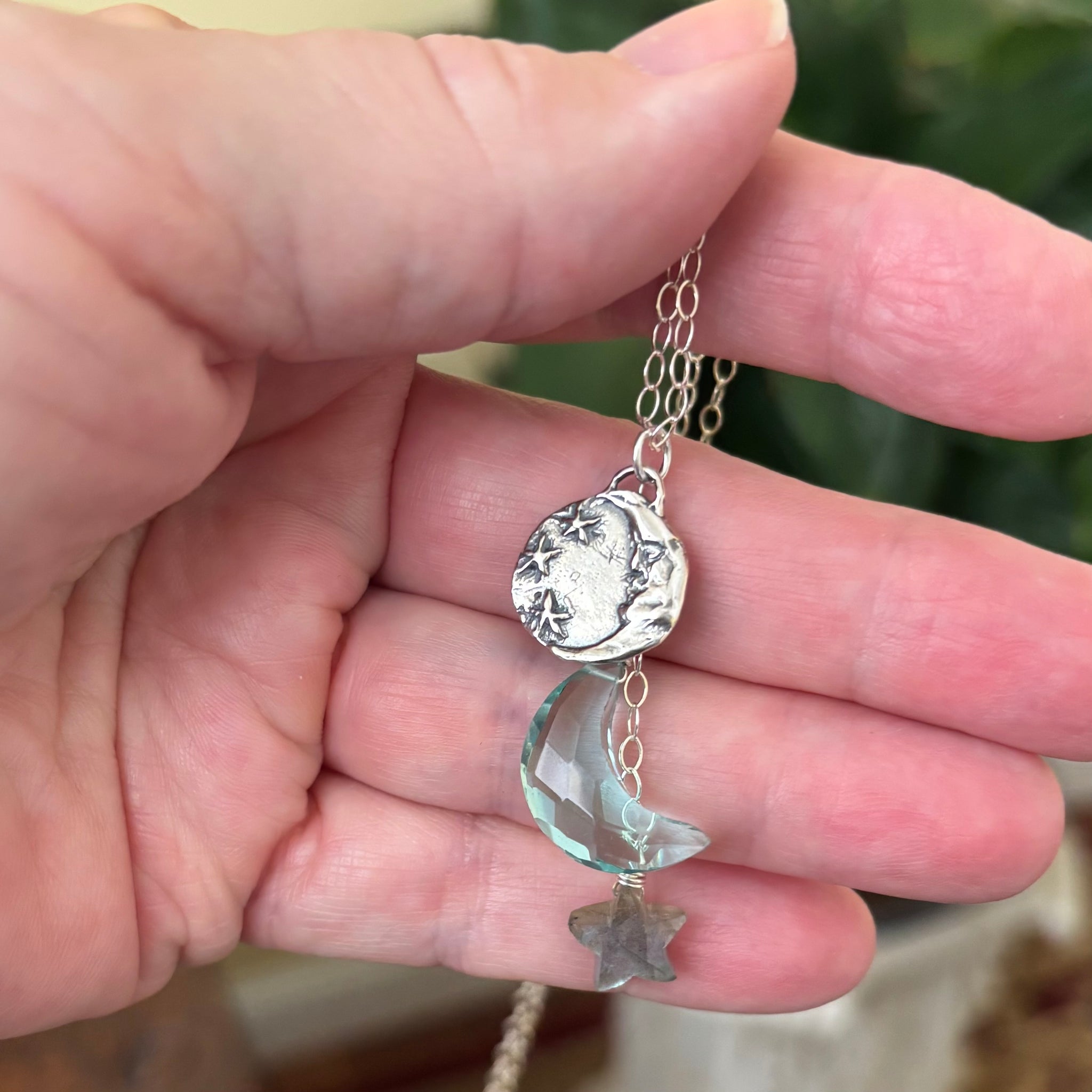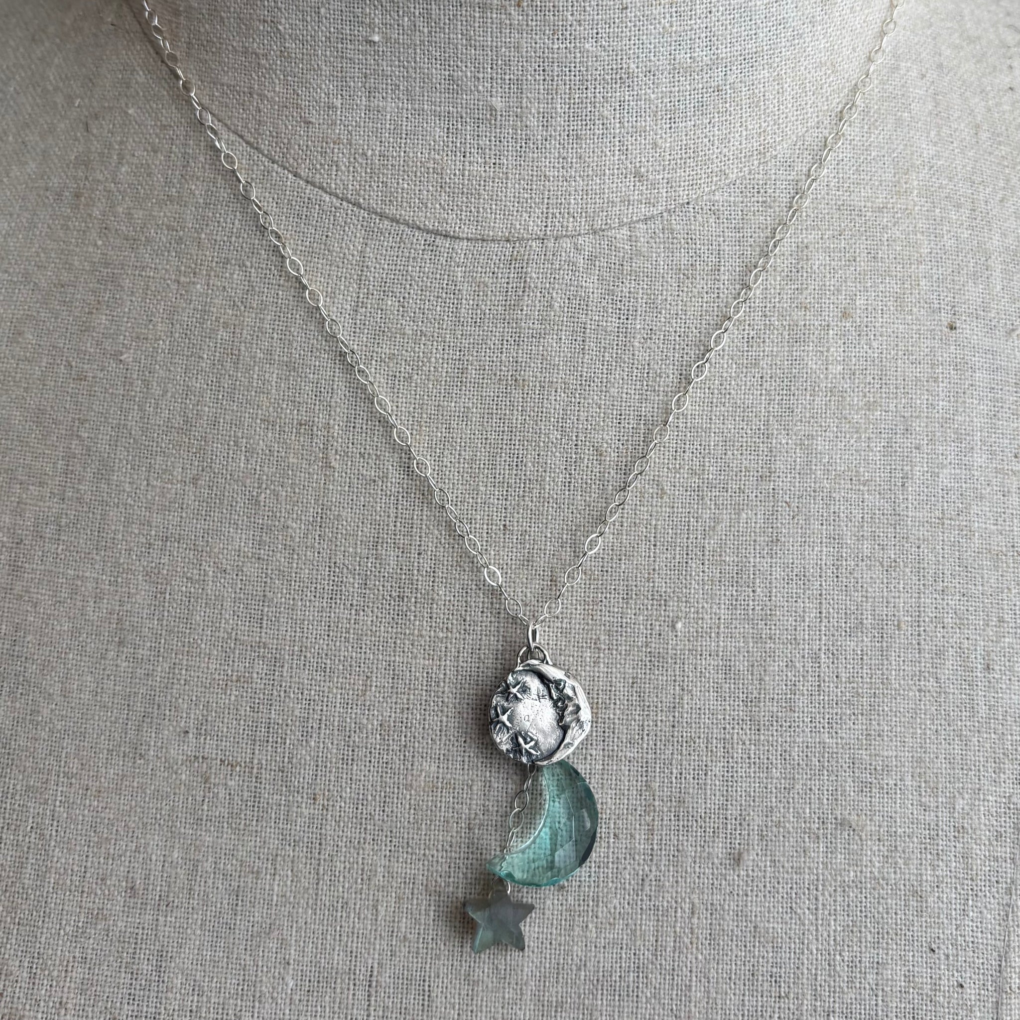 Wonderful artisan sterling silver man in the moon pendant with an aqua quartz moon and flashing labradorite star wired in sterling silver beneath it. Shown is the necklace at 20”. Please choose your length. Video is on Instagram 2/22/26 sterling silver chain and lobster clasp closure .