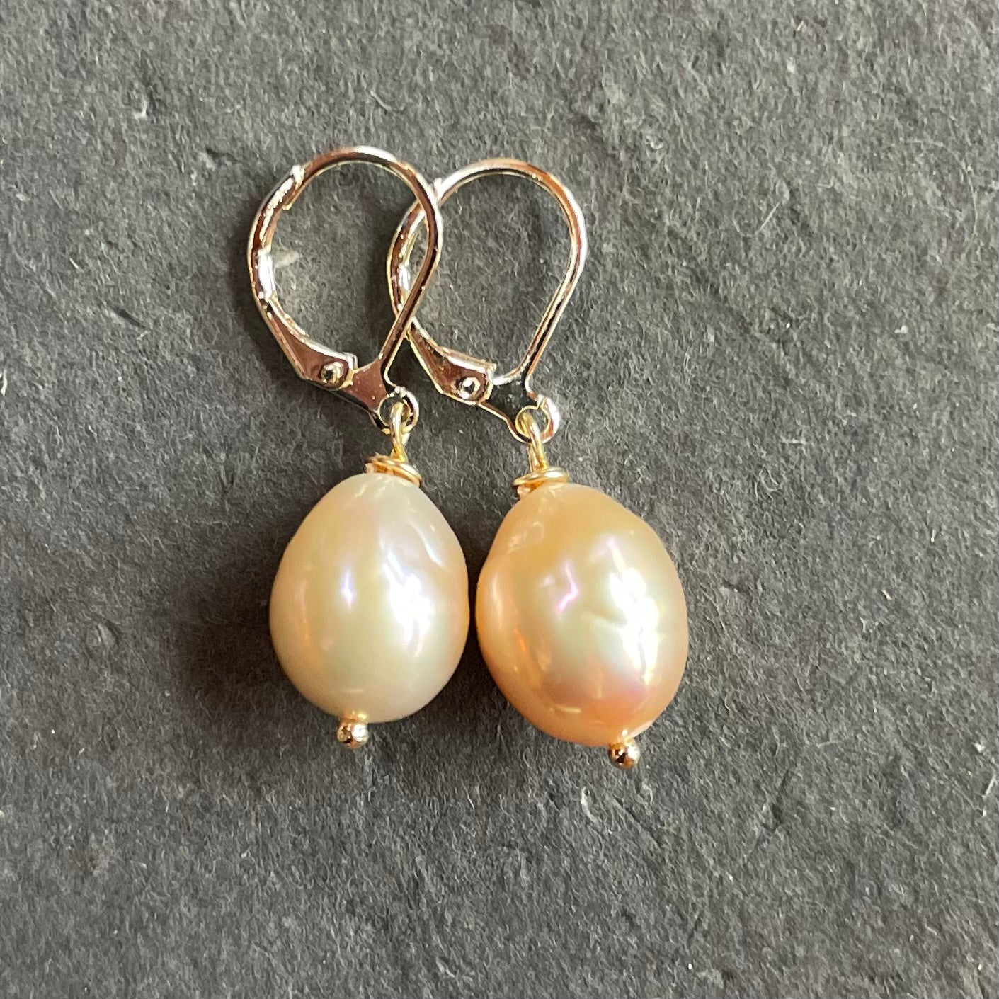 Lovely pearls in a classy pale peach ( these are not an exact match but close) color wired in gold plated wire with gold plated over brass leverback earwires. Nickel and lead free. Please note there may be surface imperfections on these types of pearls.