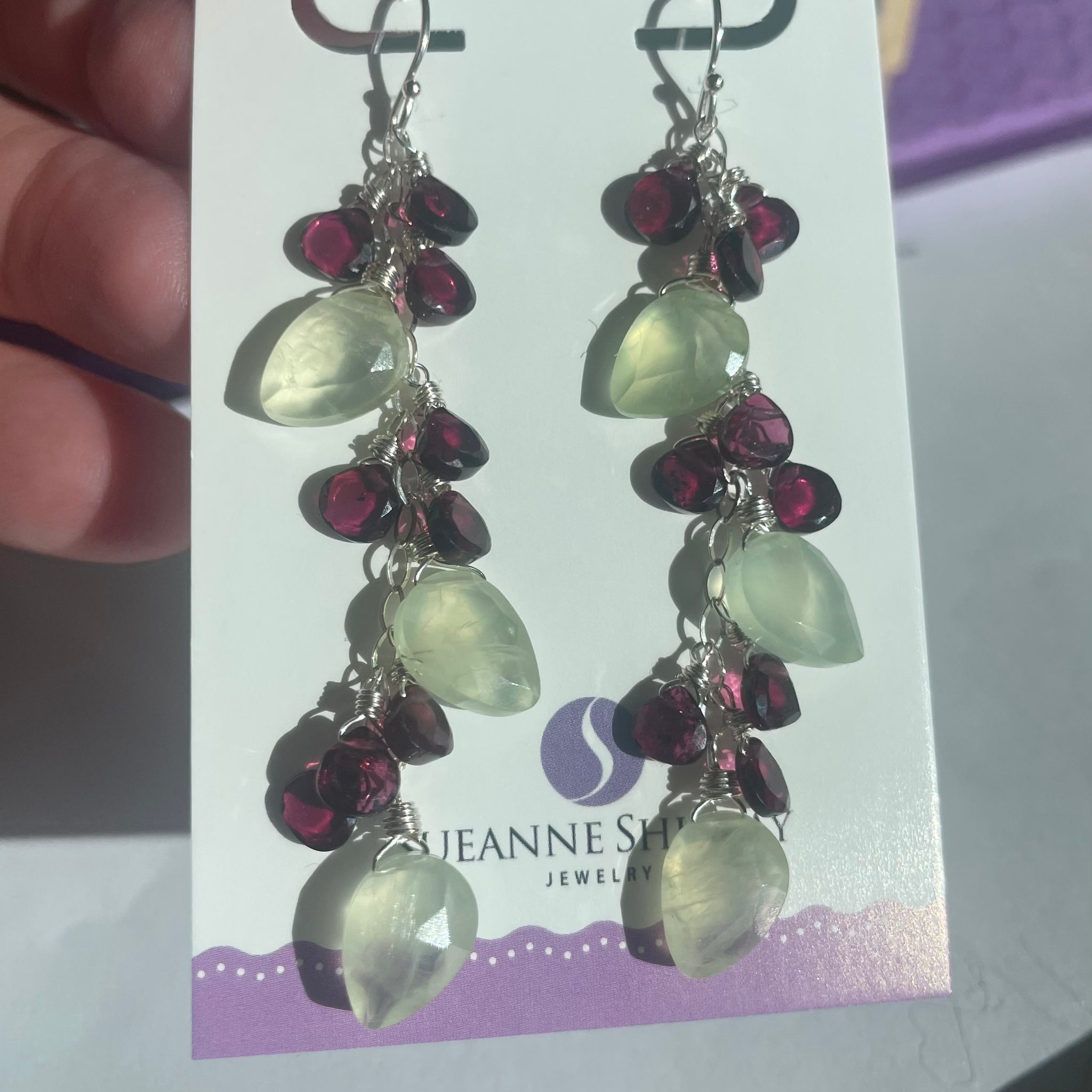 Generously sized faceted leaf prehnite with sprinkles of faceted rhodolite garnets dangling from sterling silver chain and your choice of earwire. Please choose your earwire preference. The apprx. Length is 2.75”.