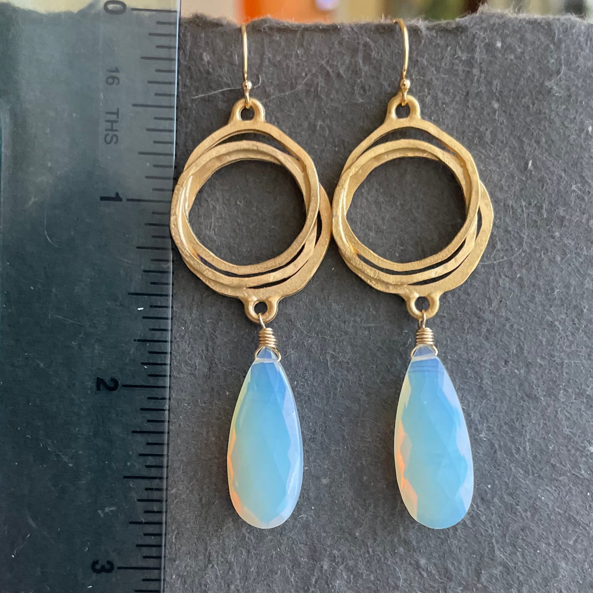 Versatile earrings that I think you’ll wear often. I have wired faceted opalite quartz with 14k gold filled wire into gold plated alloy nickel and lead free hoops. 14k gold filled French ball or leverback as an upgrade  complete the look.