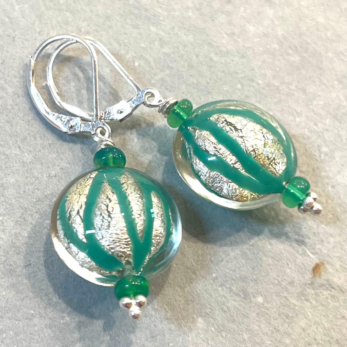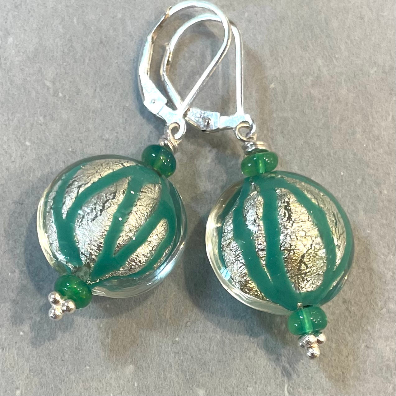 PLEASE NOTE the leverback hooks shown are an upgrade. Guess what? I met up with my Murano Italian Glass connection! These teal green accented Murano glass beads feature silver metallic foil. I have added green opals to complement the green in the Murano beads. Sterling silver wiring. Shown are sterling silver leverback hooks. THEY ARE AN UPGRADE. The apprx length is 1 5/8. The default hooks are french hook earrings, please select them from the dropdown menu.