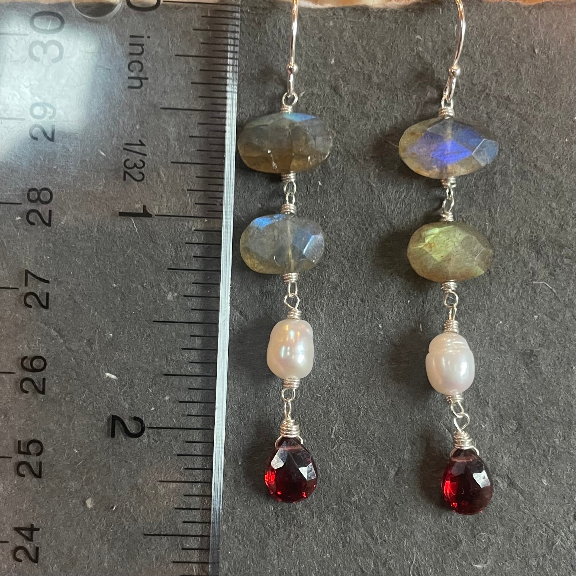 I have selected gorgeous shimmery labradorites, freshwater pearls, and red garnets and used sterling silver wire and wrapped them into this modern array. Shown are sterling silver French ball earwires.