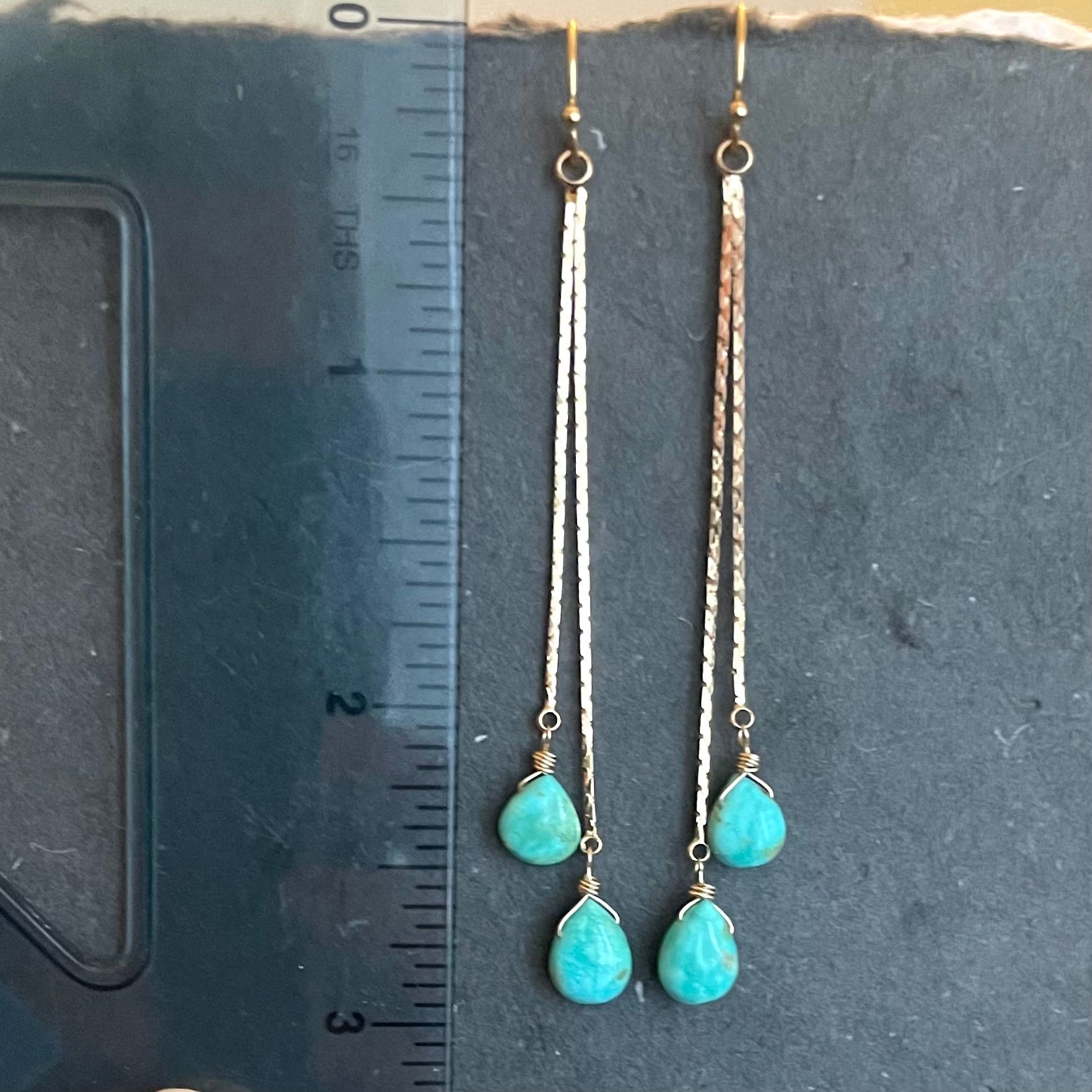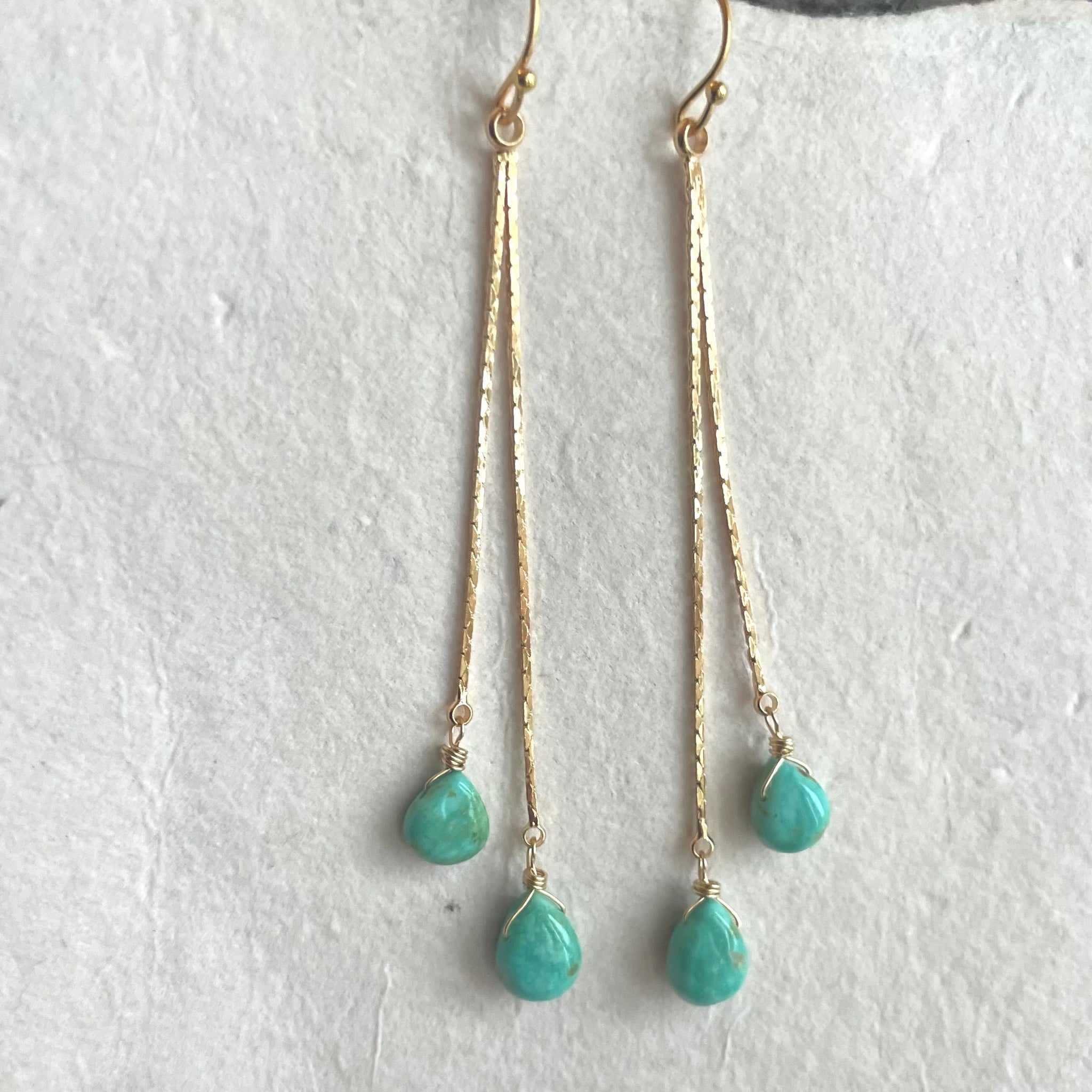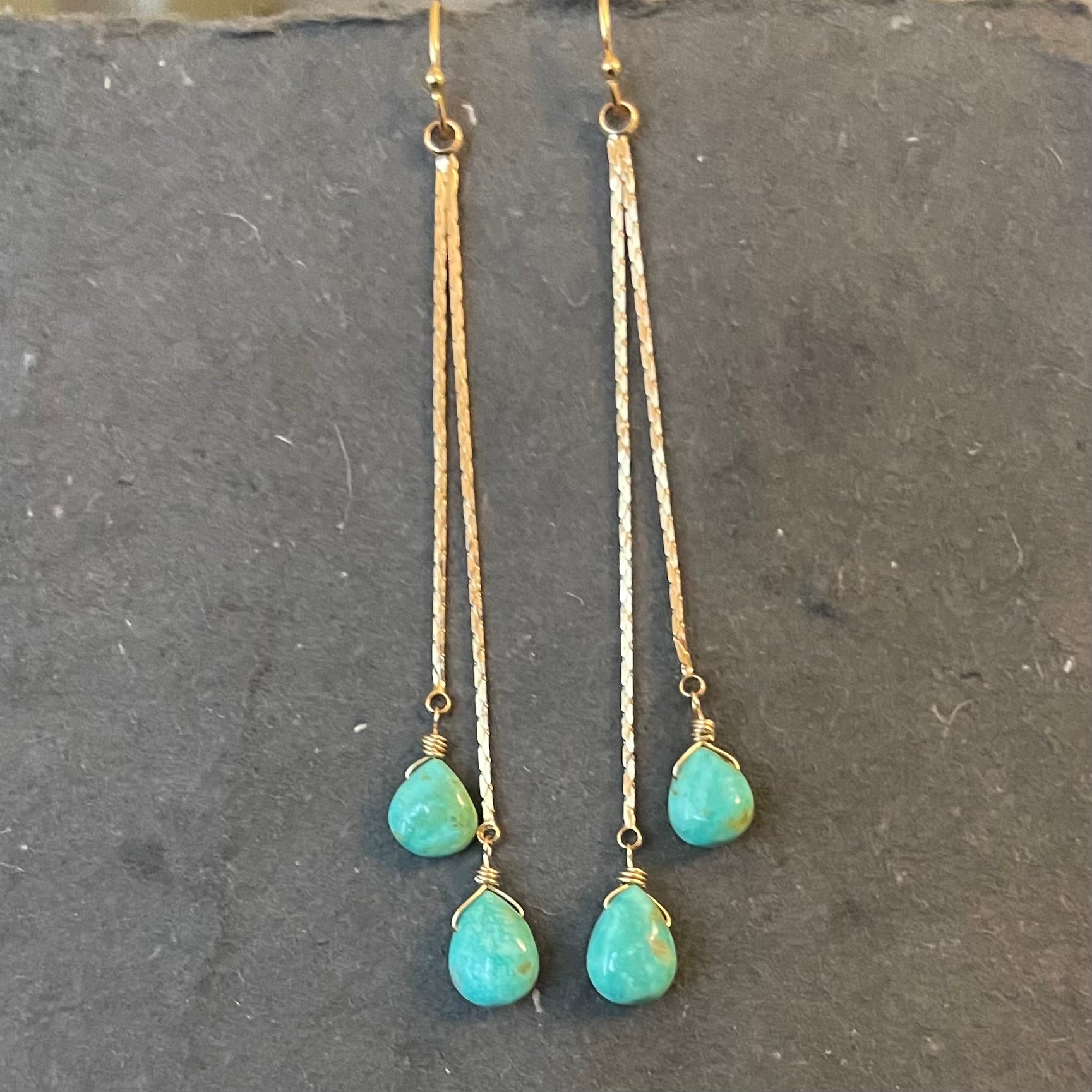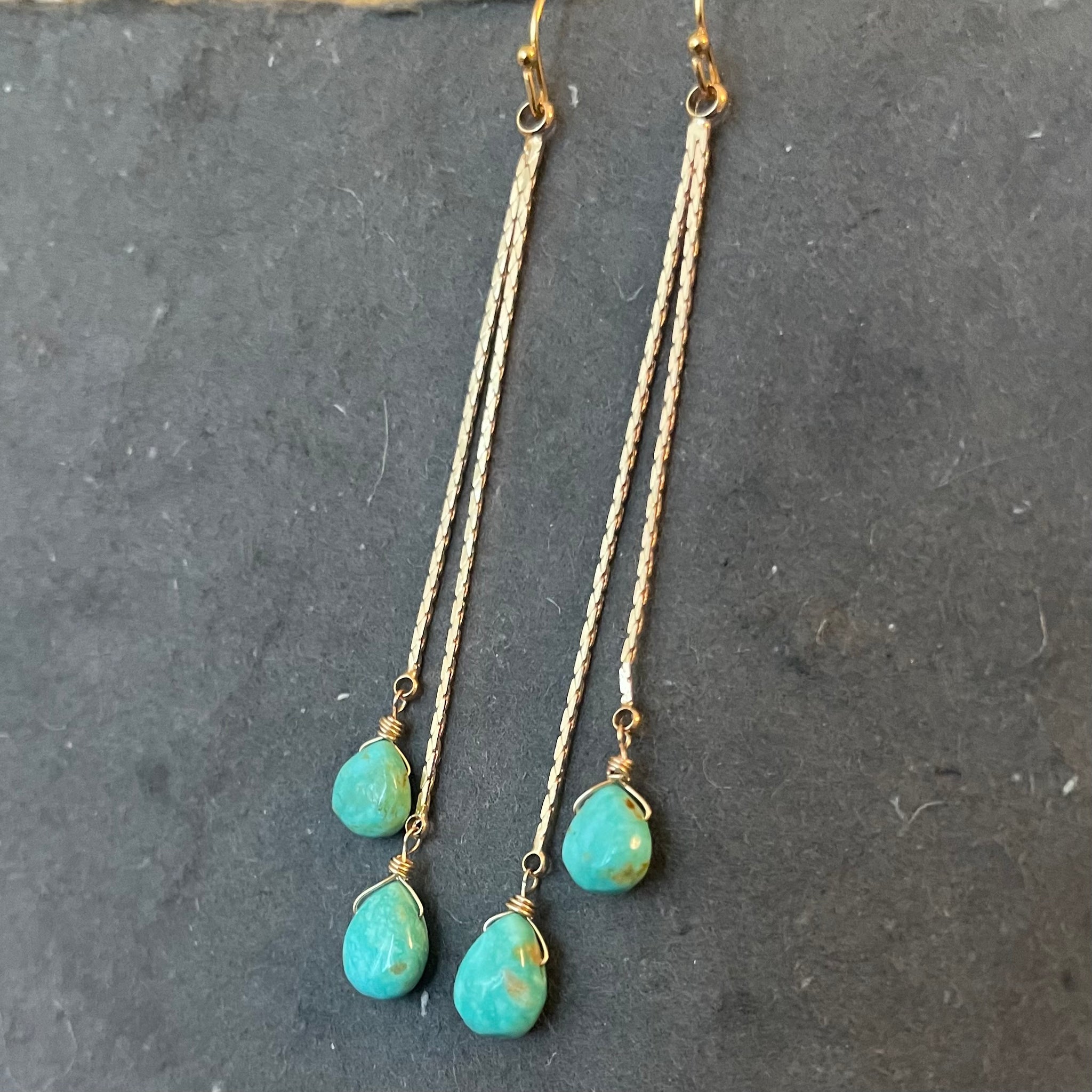 Petite Natural Arizona Turquoise wired with 14k gold filled wire and 18k gold plated brass chain tassel. The earwire shown is the 14k gold filled French ball hook. Upgrades to leverbacks are available, also in 14k gold filled.