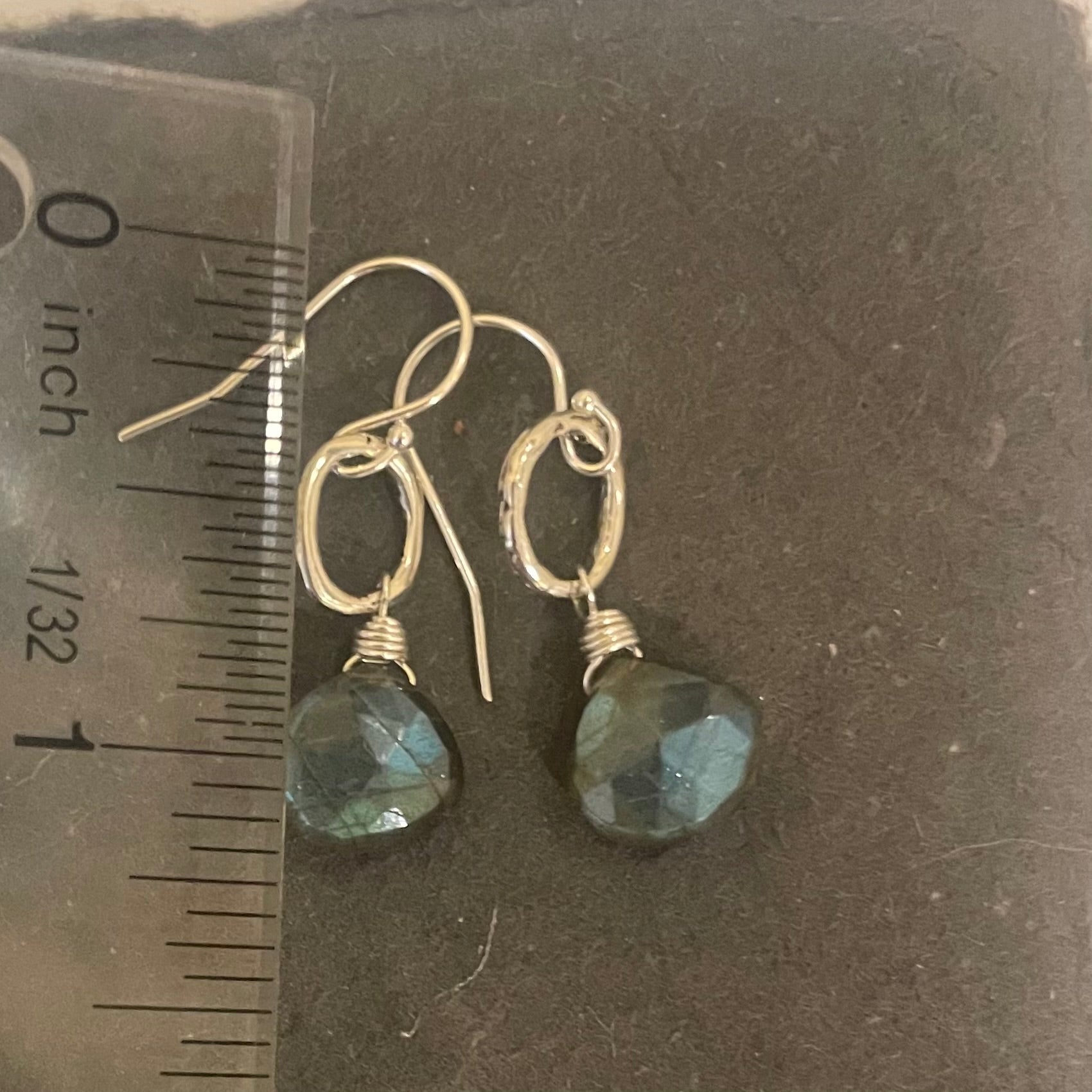 Blue flash faceted labradorite on small artisan forged mini hoops. Shown are sterling silver French ball earwires. Please choose your earwire preference. 1.25” total length. All labradorites are unique.