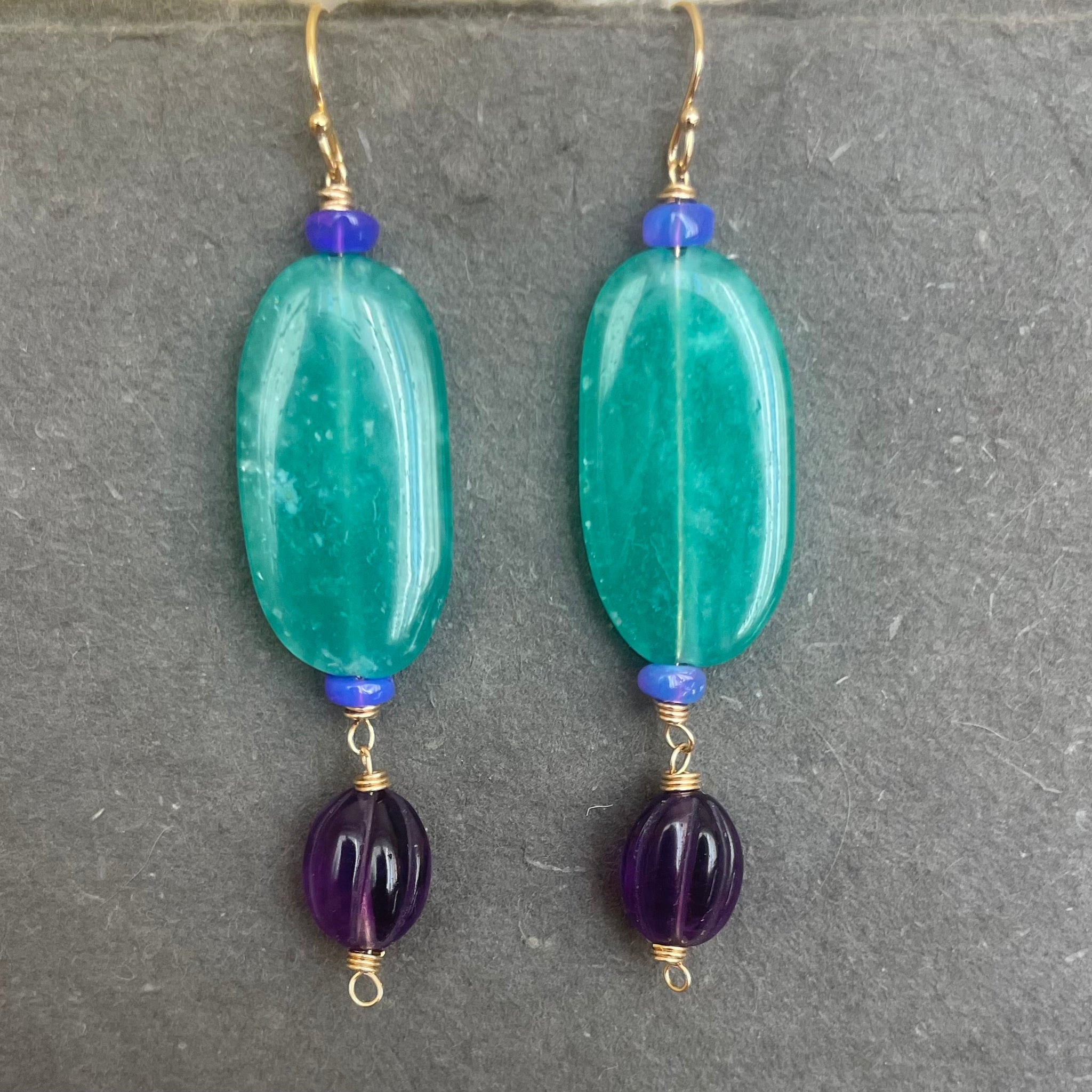 I picked up a strand of these absolutely beautiful smooth amazonites at a show recently. What drew me in was the colors. It’s not emerald, it’s sort of emerald with a little blue cast, if you know how to mix colors, you know what I mean. Very unusual! I also love what’s going on inside the stones. These are shown wired with 14k gold filled wire, and a carved amethyst. The earwire shown is a 14k gold filled French ball hook. The little stones are Welo opals. I enclose rubber backings.