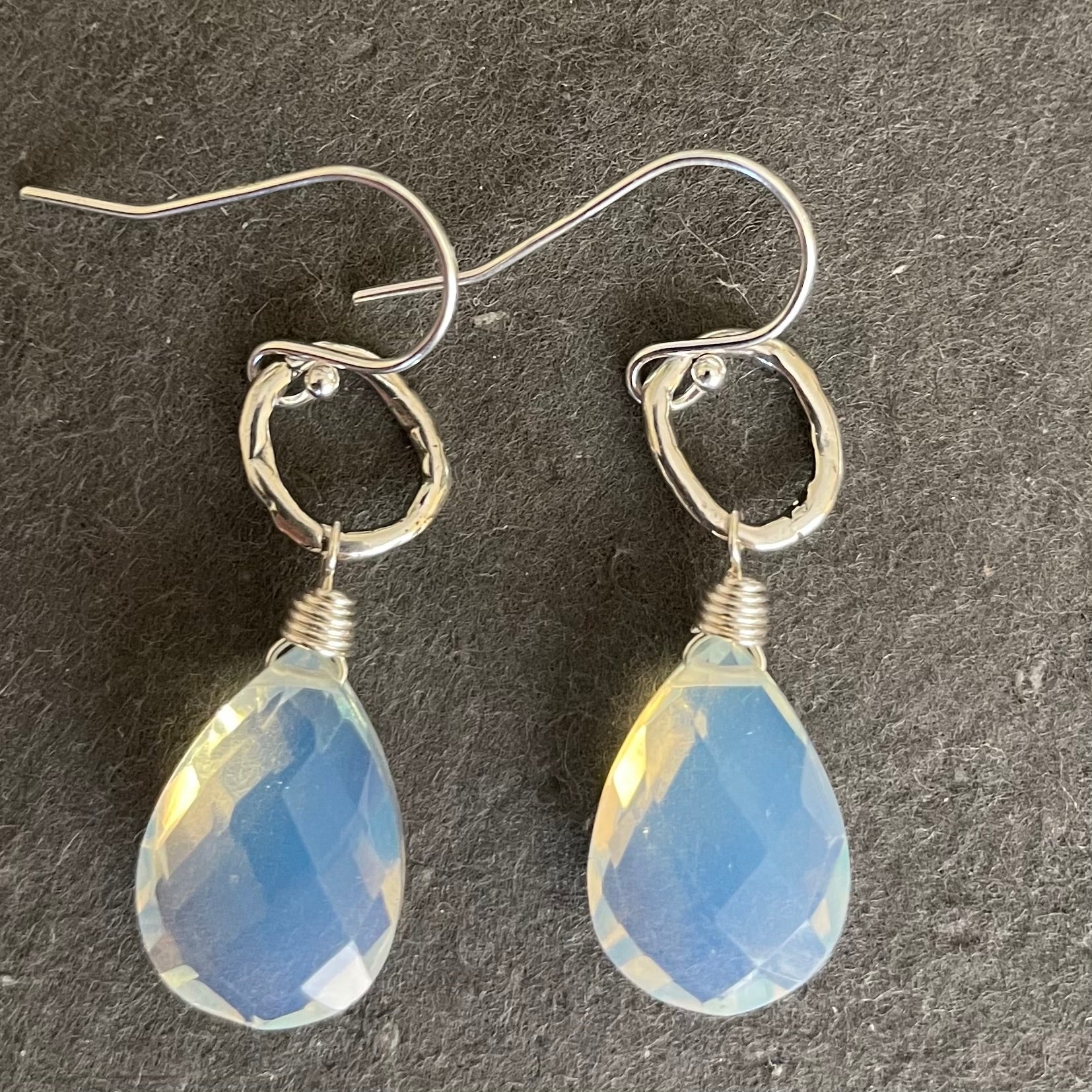 Lovely sparkling opalite quartz in pear cut flashes and glistens from an artisan sterling silver hoop. The total length is 1 3/8”.