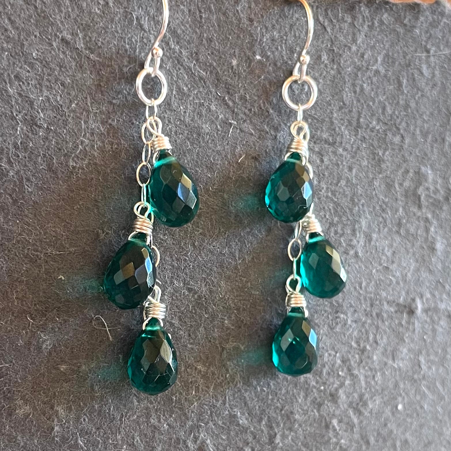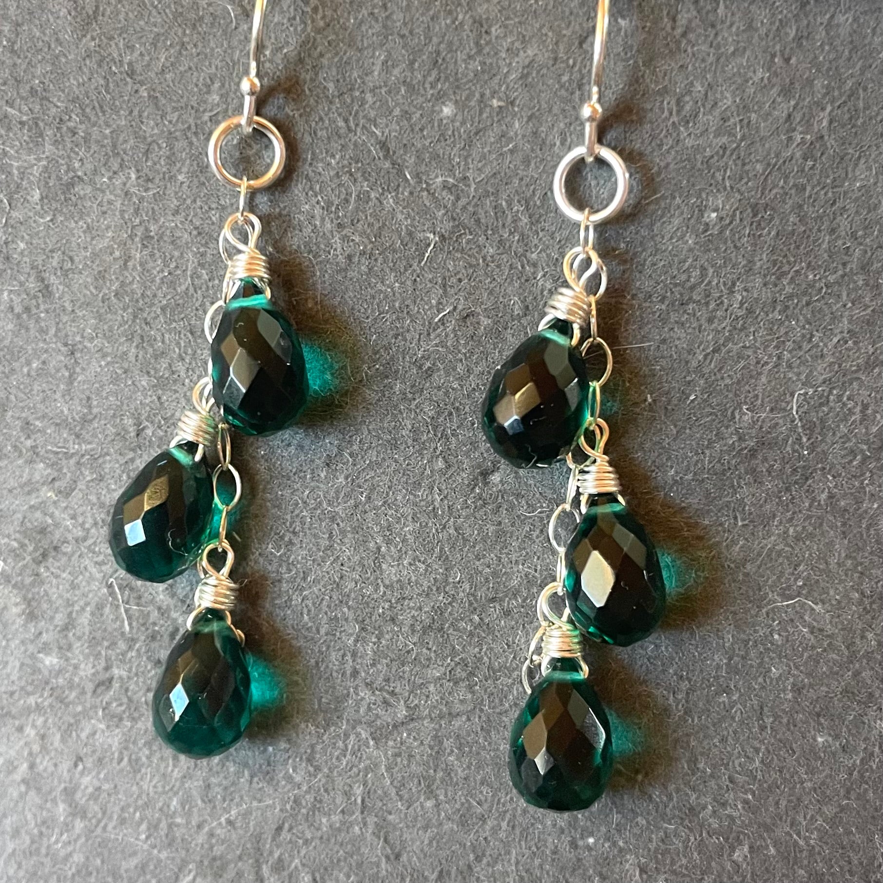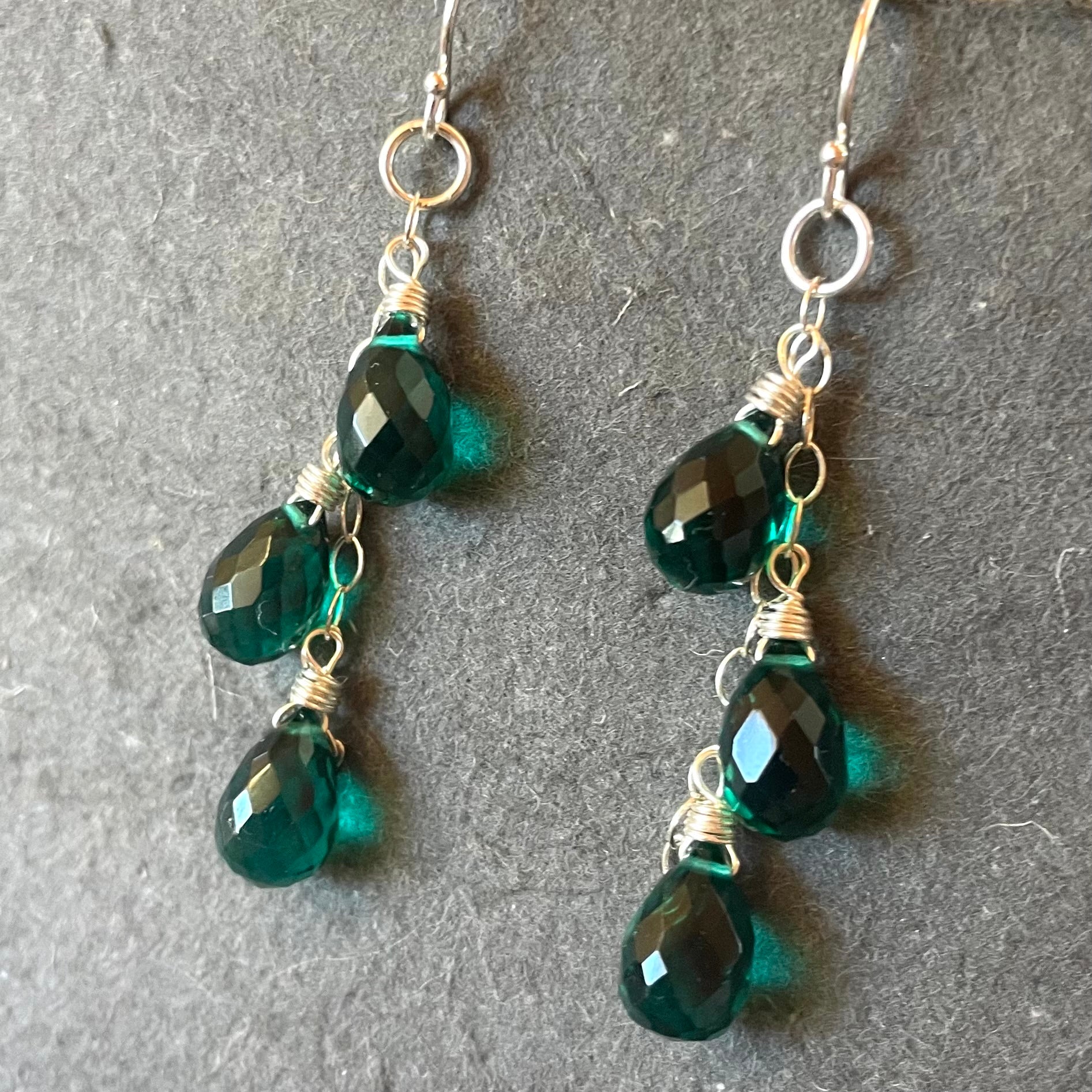 Simple and beautiful faceted emerald green quartz teardrops wired in your choice of metal and earwires. If no option is selected, the default will be the sterling silver French ball earwire shown. Total length is about 2 1/8”.