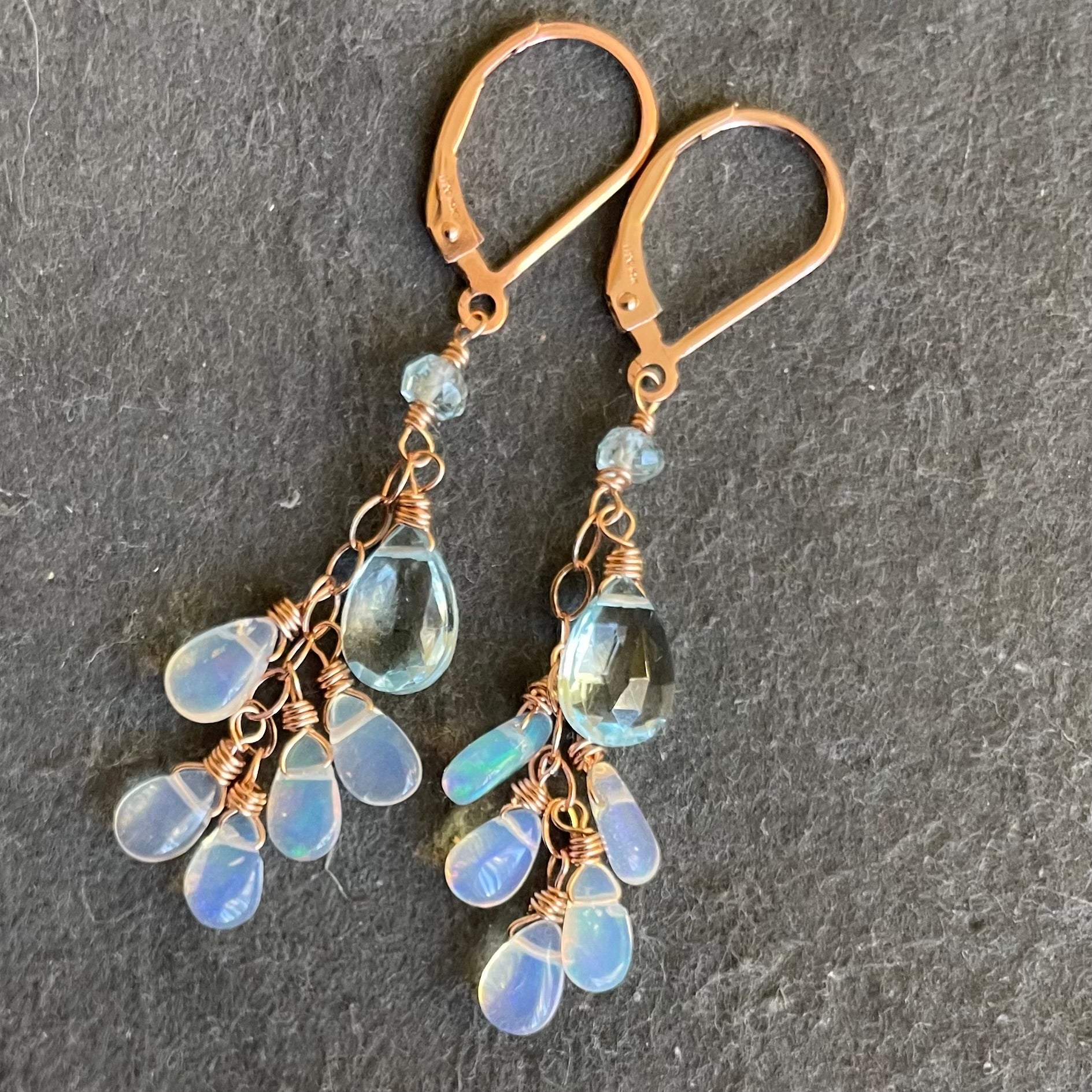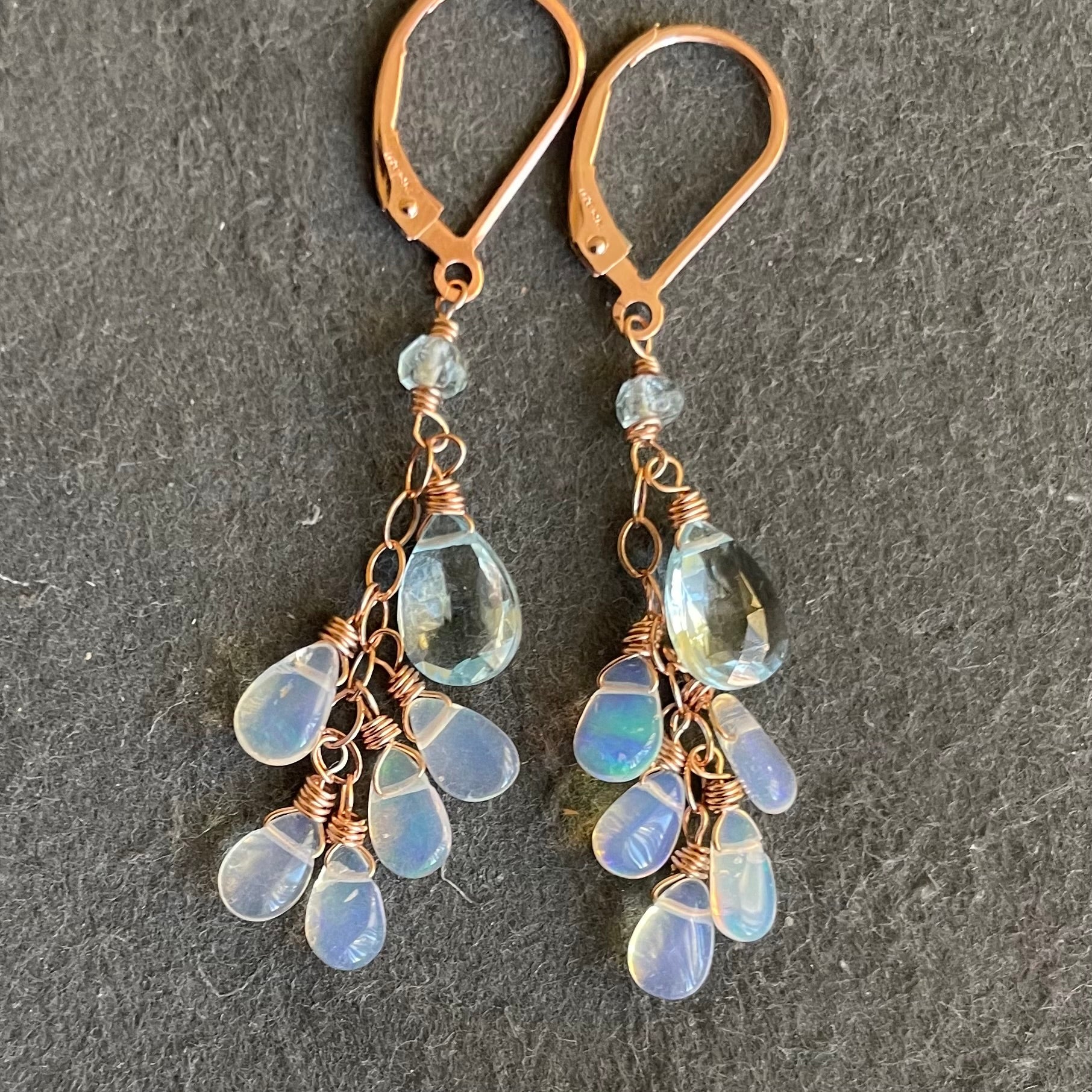 Natural blue topaz is so pretty! I have started these off with a small aquamarine rondelles, followed my natural blue topaz. Then come the smooth colorful welo opals. The wiring, earwires and chain are all 14k rose gold filled. 2” long.