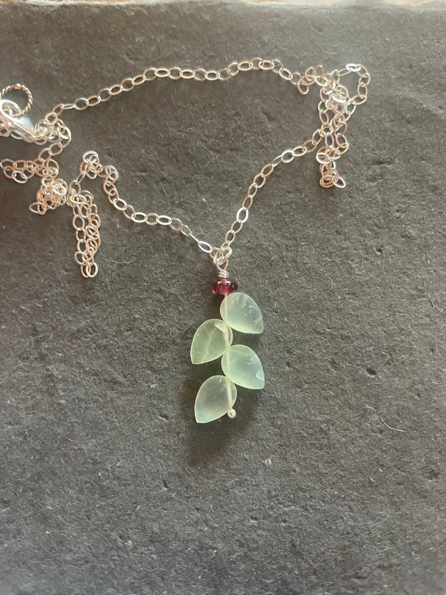Faceted Leaf Cut prehnite and smooth garnet wired on a tarnish resistant silver or gold pin with a sterling silver or 14k gold filled chain and lobster clasp. Please choose your metal and length. Please select your necklace length at shirzay.com. If shopping directly from Instagram or Facebook, the default is 18”. Generous lobster clasp closure.