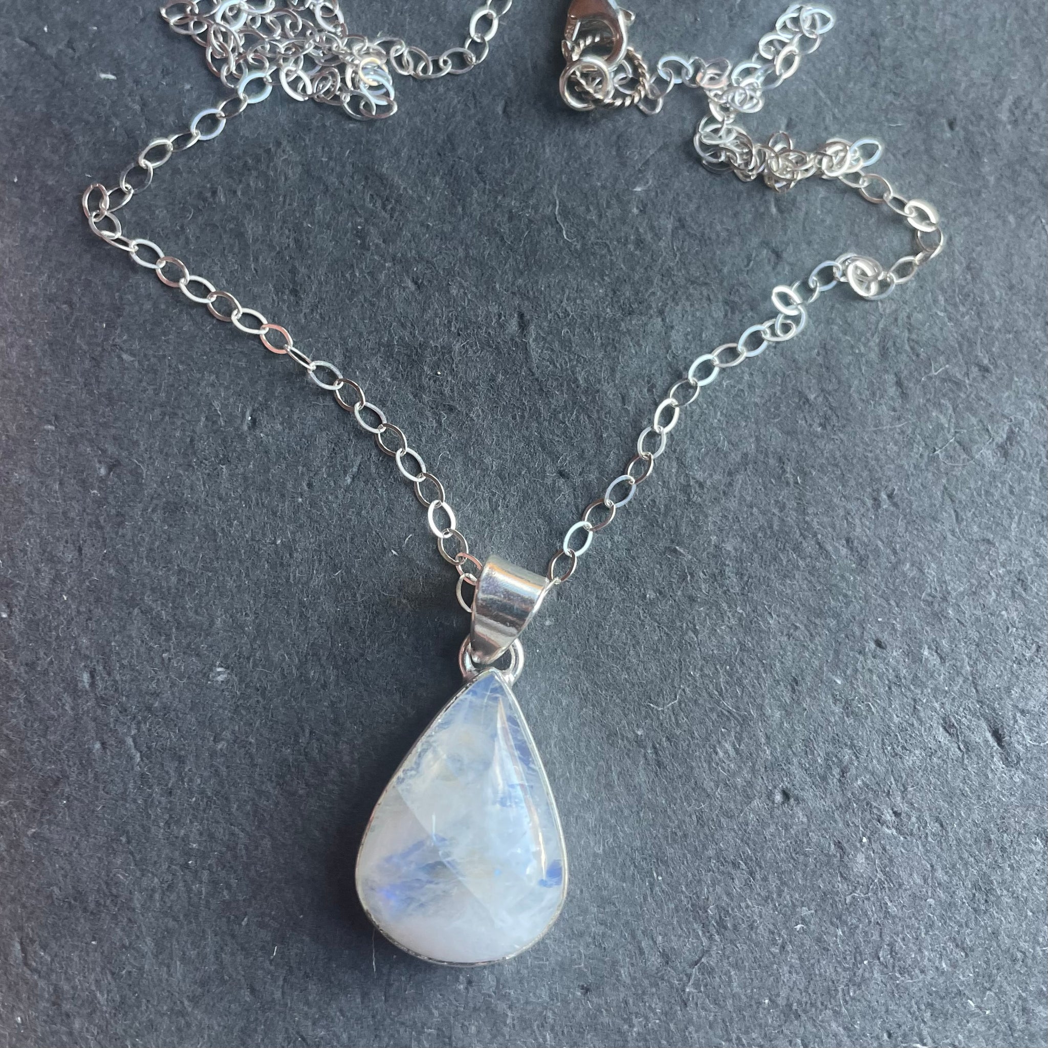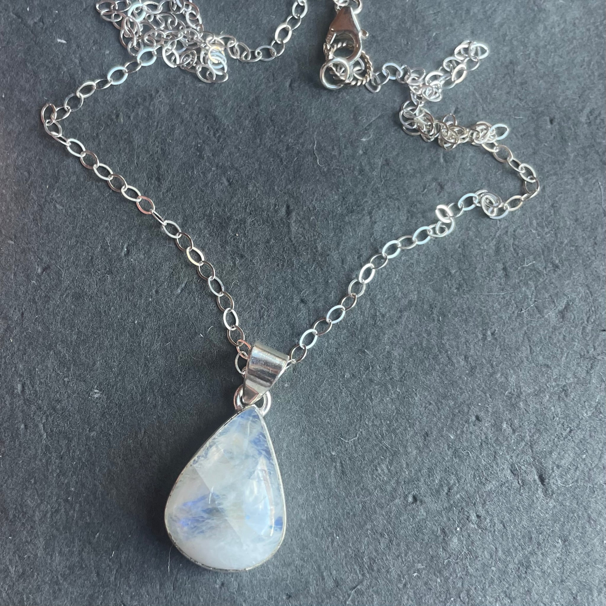 Hello Gorgeous! A smooth rainbow moonstone set in solid sterling silver with sterling silver chain and lobster clasp. This is a nice quality piece. Please select your necklace length at shirzay.com. If shopping directly from Instagram or Facebook, the default is 18”. Generous lobster clasp closure.
