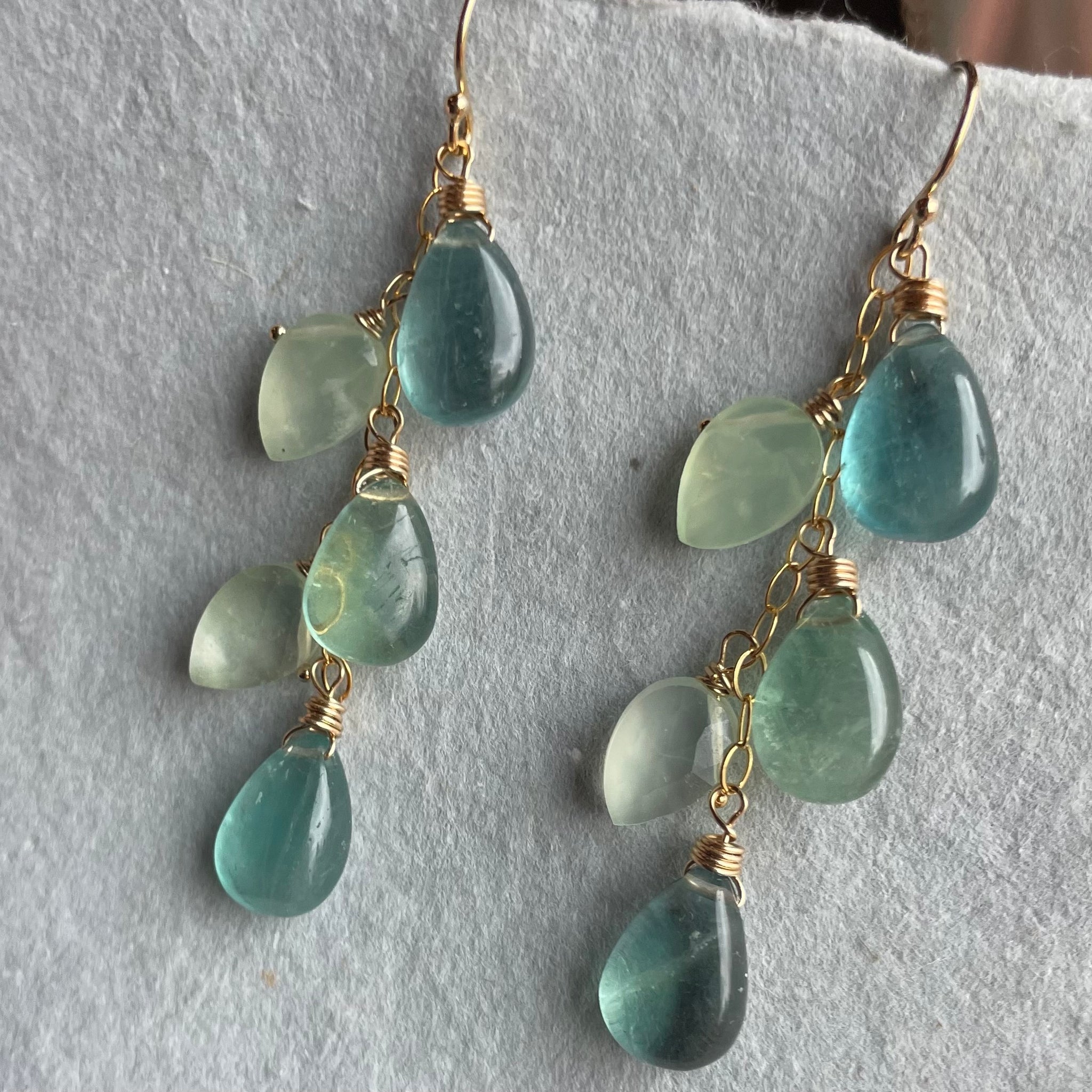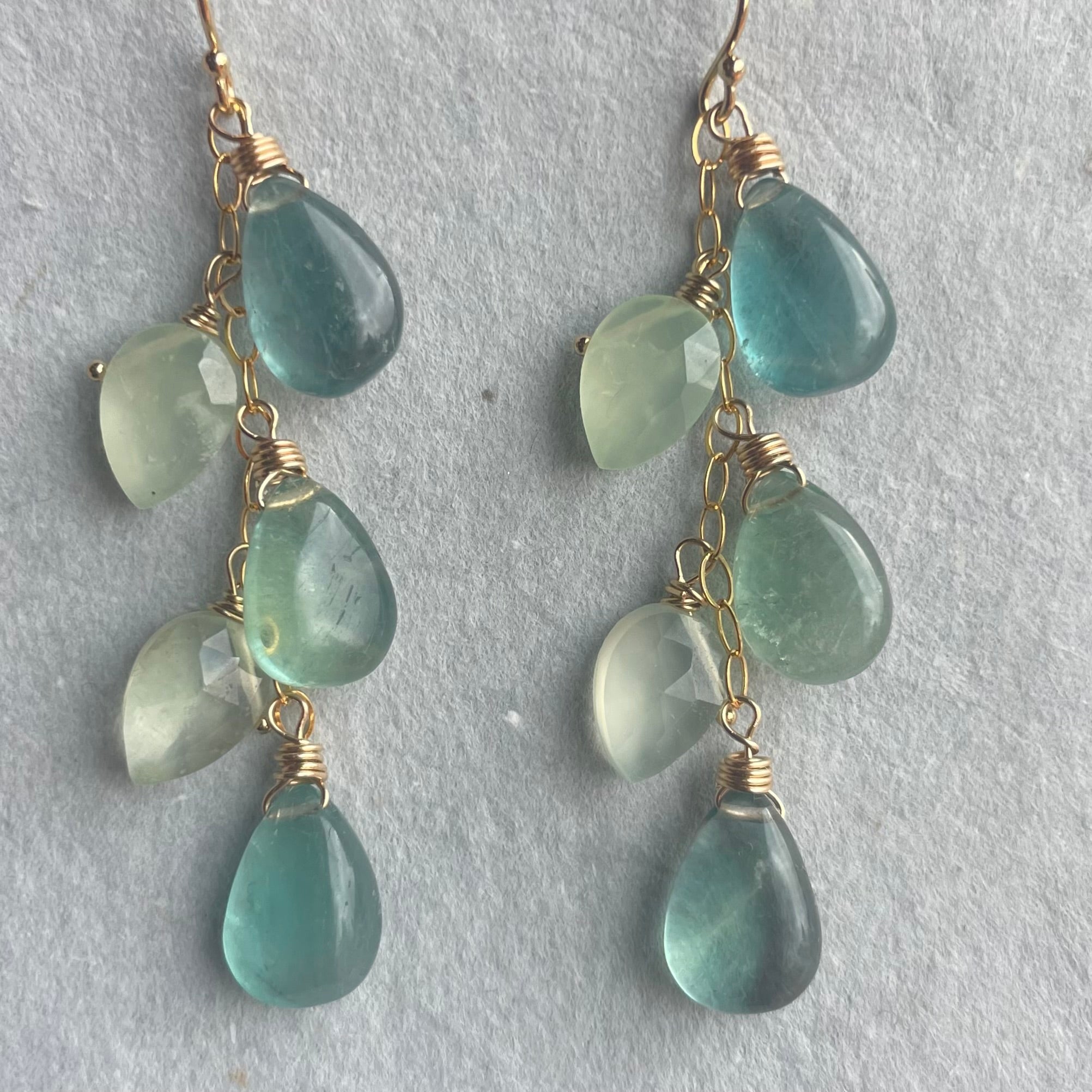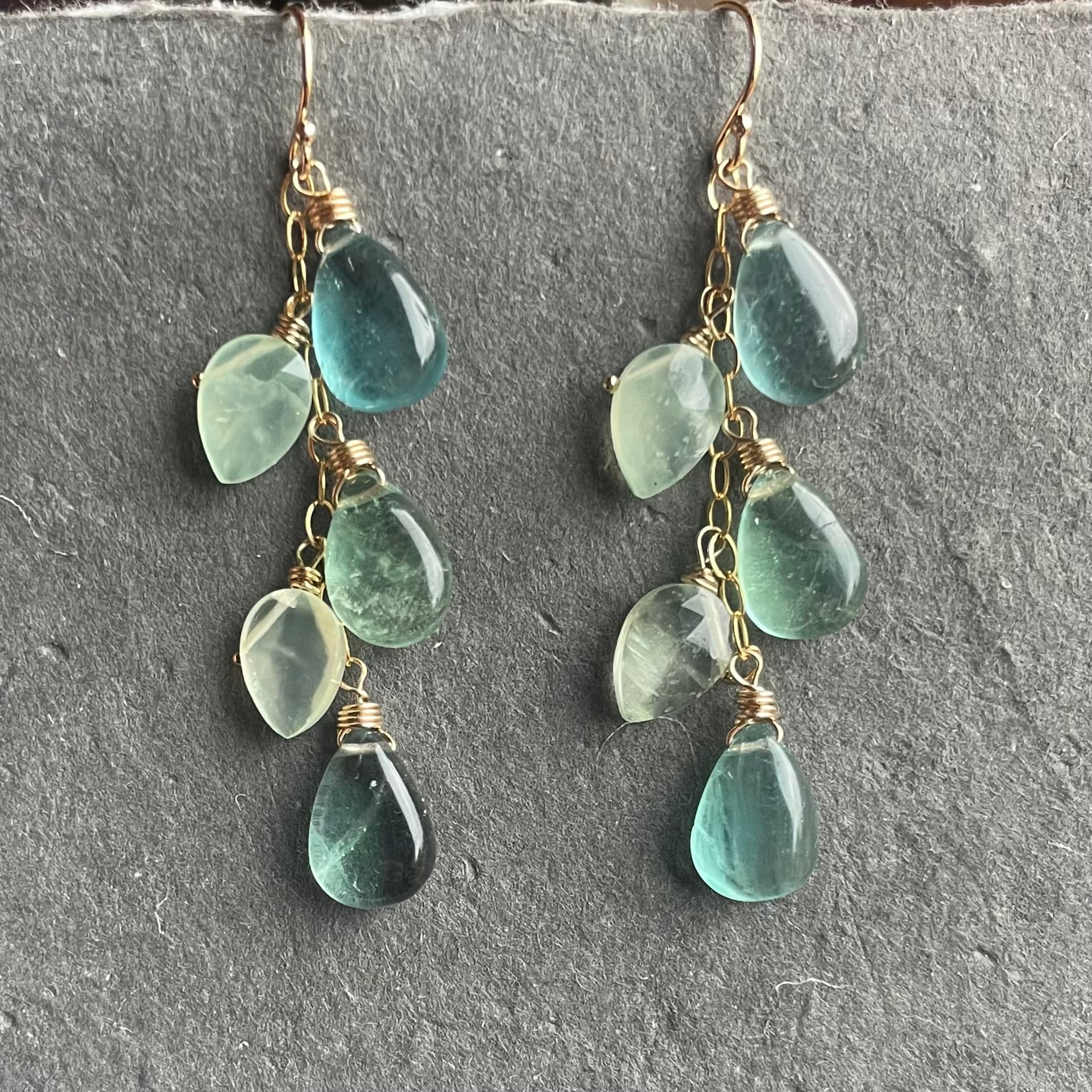 Drop Dead Gorgeous smooth fluorite and leaf cut faceted prehnite is wired with 14k gold filled wire on earwire.
